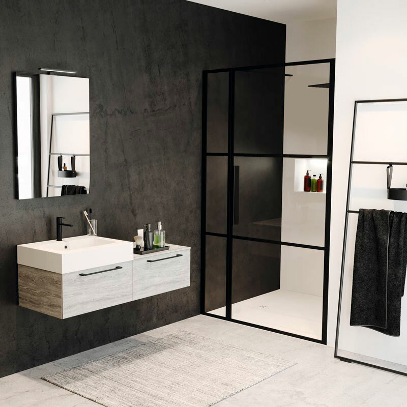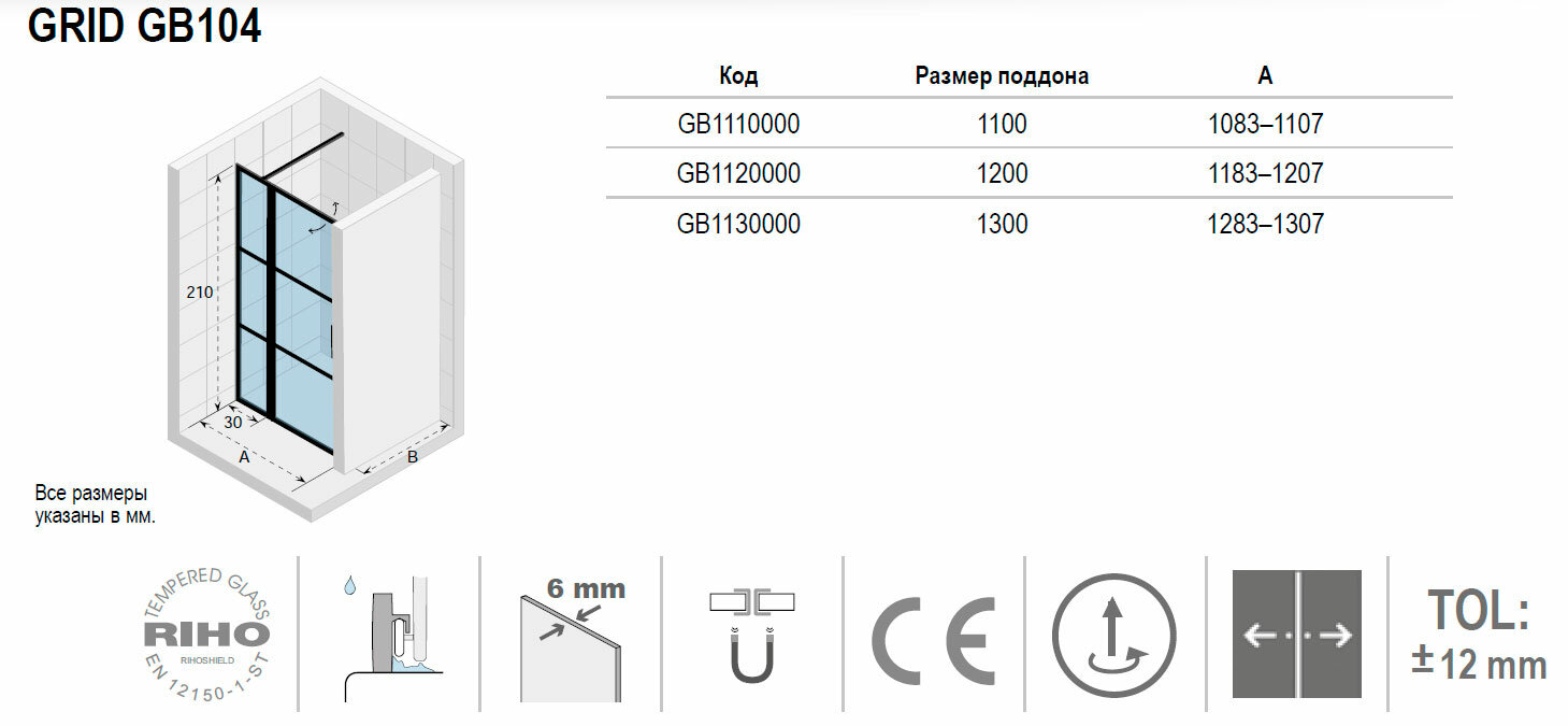 Глубина: 10 см. Серия:Grid. Высота: 2000 мм. Вид: дверь в нишу. Ориентация: L/R. Регулируемая ширина: +/- 12mm. Толщина полотна двери, мм: 6 mm. Материал полотна двери: стекло. Цвет профиля: черный. Материал профиля: aluminium