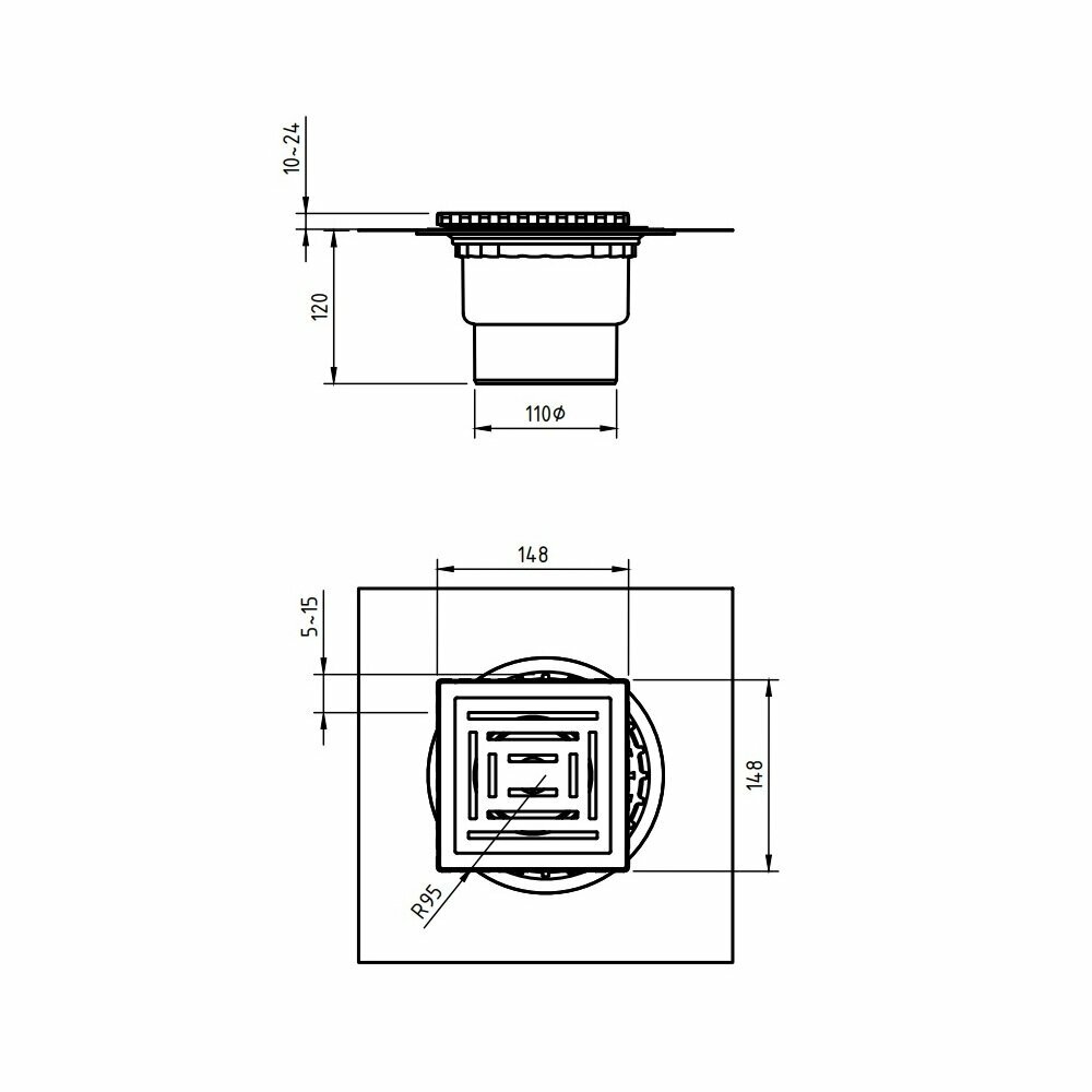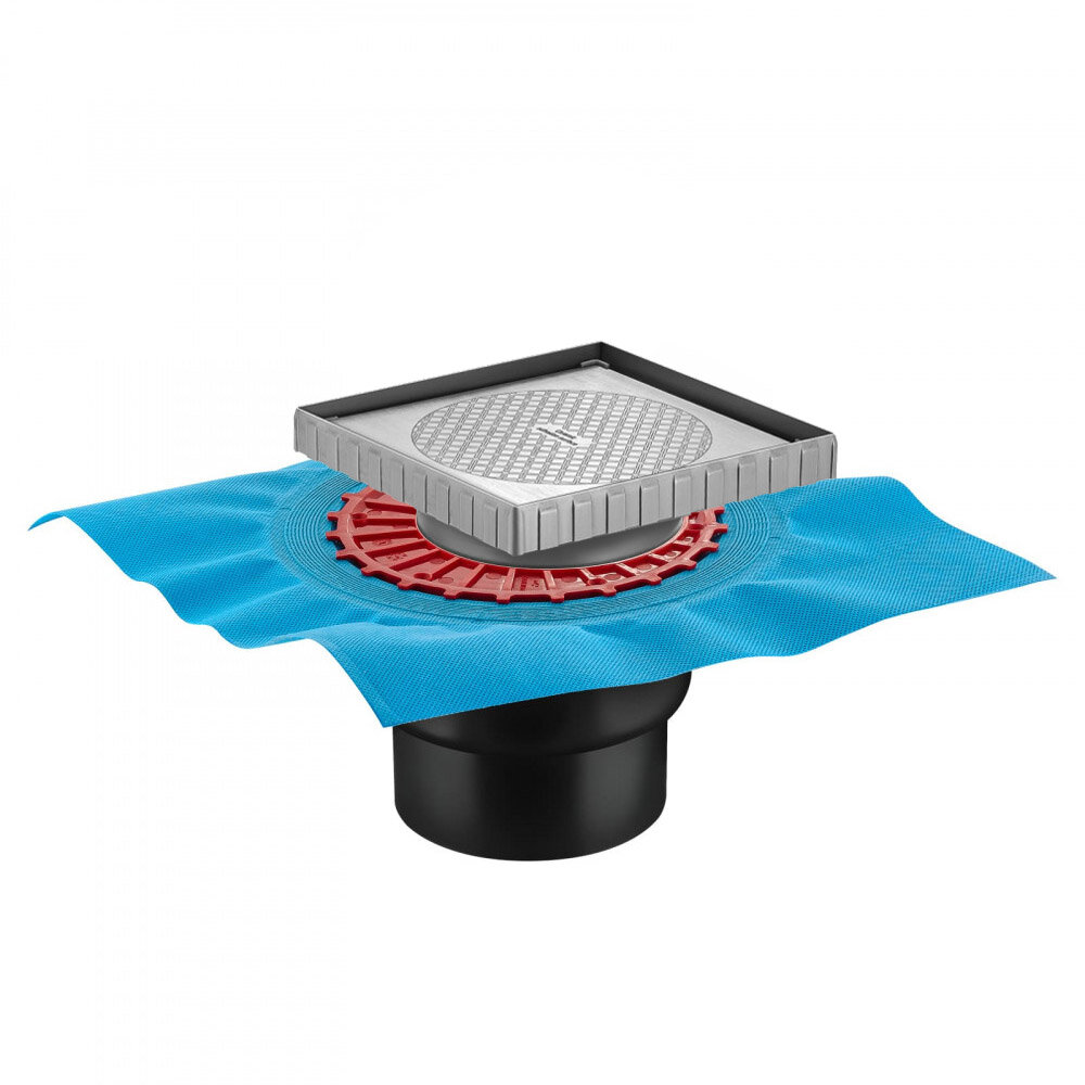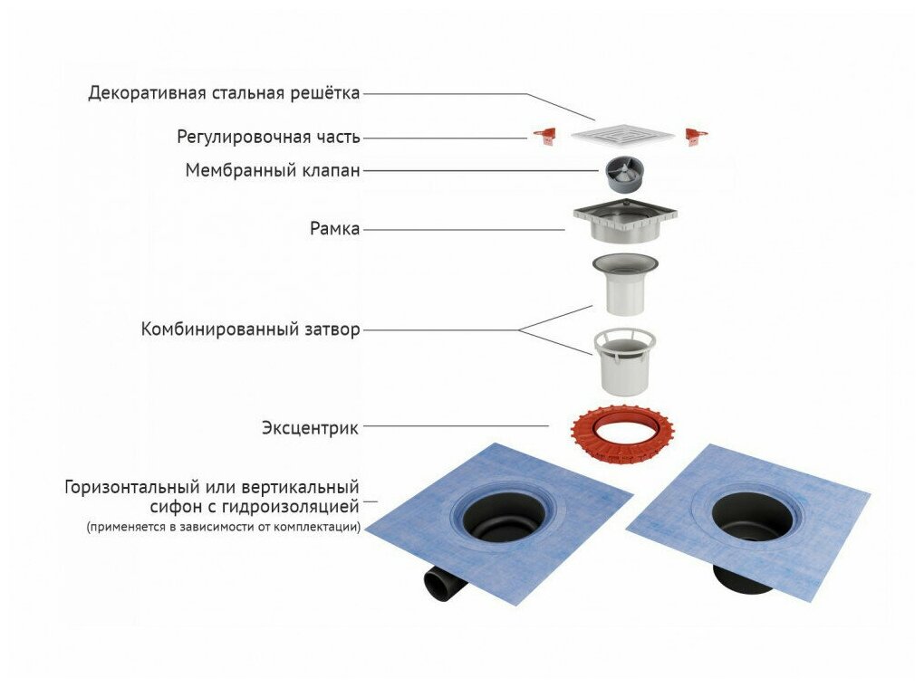 Решетка для плитки, нержавеющая сталь AISI 304. Горловина трапа и эксцентрик, пластик. Монтажная заглушка, PP. Корпус PP с гидроизоляцией: вертикальный выпуск D50/75/110, монтаж 360°. Комбинированный затвор. Фланец с 3 сторон загибается на 90°. Монтажный ключ, пластик