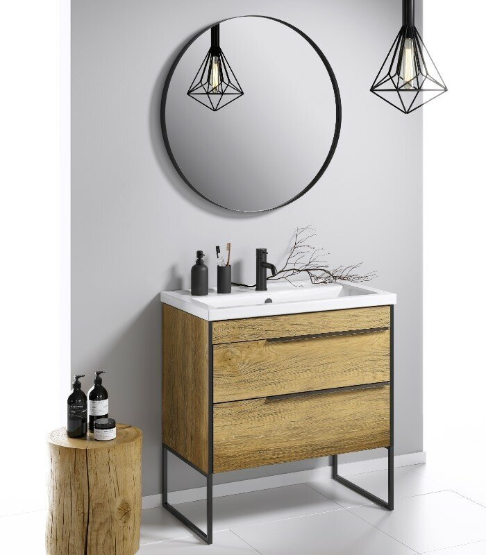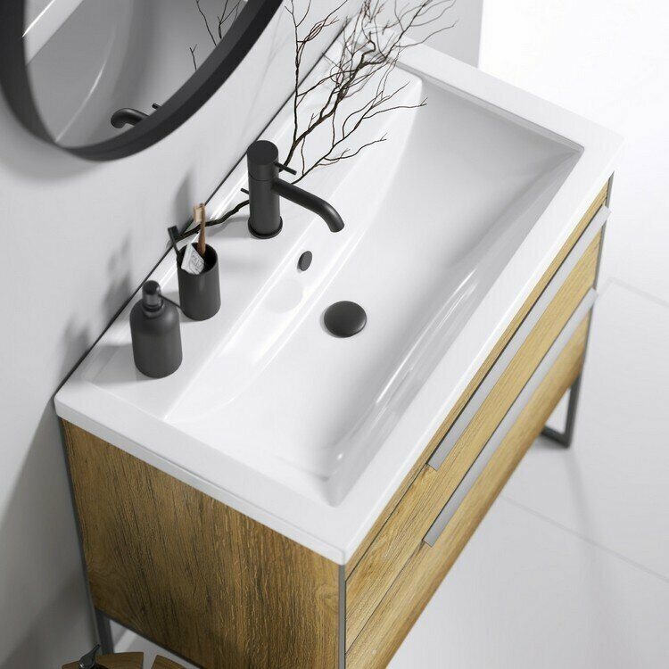 Покрытие корпуса-матовое, ламинат. Покрытие фасада-матовое, ламинат. Материал корпуса-ДСП. Материал фасада-ДСП. Форма раковины-прямоугольная. Фурнитура-черный. Система хранения-с ящиками. Оснащение-крепления. Готовые отверстия под смеситель-на 1 отверстие. Цвет раковины-белый. Материал раковины-фаянс
