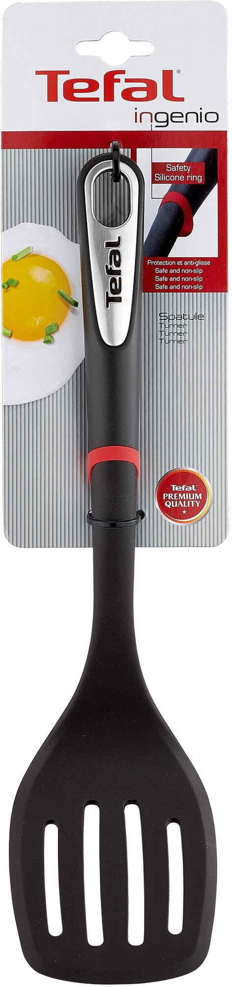 Tefal представляет серию Tefal Ingenio – премиальные кухонные гаджеты, которые созданы в удобном и практичном дизайне для ежедневного использования. Гаджеты Ingenio выполнены из устойчивых материалов, безопасны в использовании и легко чистятся после каждого использования. Лопатка Ingenio предназначена для использования при приготовлении рыбы и мяса – ей удобно переворачивать продукты и подавать готовое блюдо. Красное силиконовое кольцо защищает ручку лопатки от перегрева при соприкосновении с горячими бортами посуды и не дает ей соскользнуть внутрь.