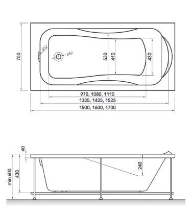 Ванна без ножек/каркаса, без фронтального экрана, без слива перелива.