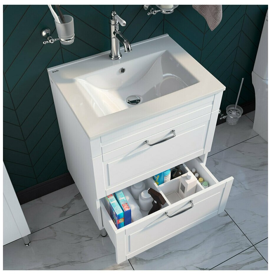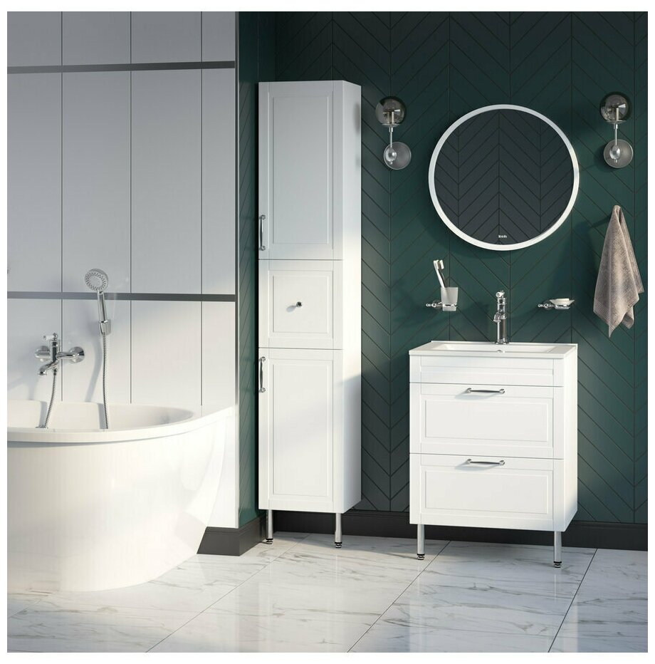 Тумба с умывальником для ванной комнаты, напольная. Размеры тумбы (с ножками): 455х603х810 мм (ДхШхВ). Фасад ЛМДФ 16 мм в эмали (белый матовый). Корпус ЛДСП 16 мм в эмали. Размеры умывальника: 465х600х175 мм (ДхШхВ). Два выдвижных ящика с направляющими скрытого монтажа полного выдвижения с доводчиками. Упаковка: картон, пленка, пенопластовые уголки.