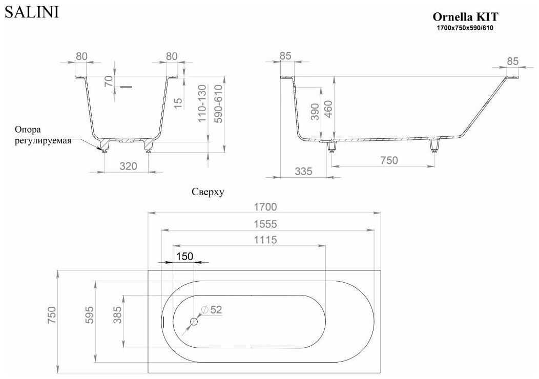 - Размер ванны (ШхВхД): 750x610x1690 мм.