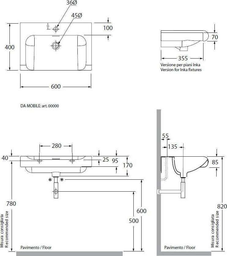 KERASAN Inka Project Раковина INKA 60x40x35,5 с 1 отверстием под смеситель,цвет белый