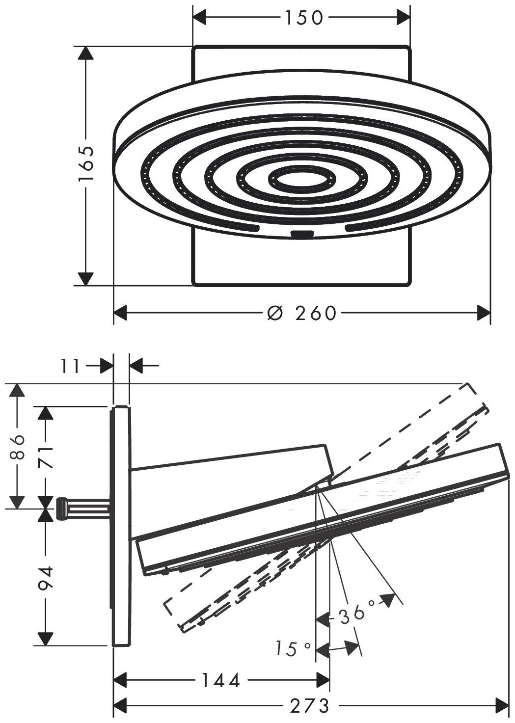 - Размер душевого диска: 260 мм.