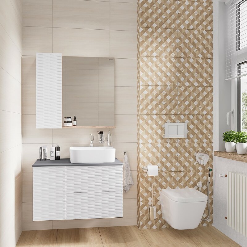 Шкаф-зеркало Альба 80 см отражает современные тенденции в дизайне мебели для ванных комнат: белый матовый цвет с 3D рисунком безупречно сочетается с текстурой под дерево , отсутствие лишних деталей. Полки в шкафу слева обеспечивают быстрый доступ к аксессуарам. Зеркальный шкаф изготовлен из ЛДСП, устойчивой к механическим воздействиям, перепадам температур и высокой влажности. Подвесы для крепления шкафа - в комплекте.
