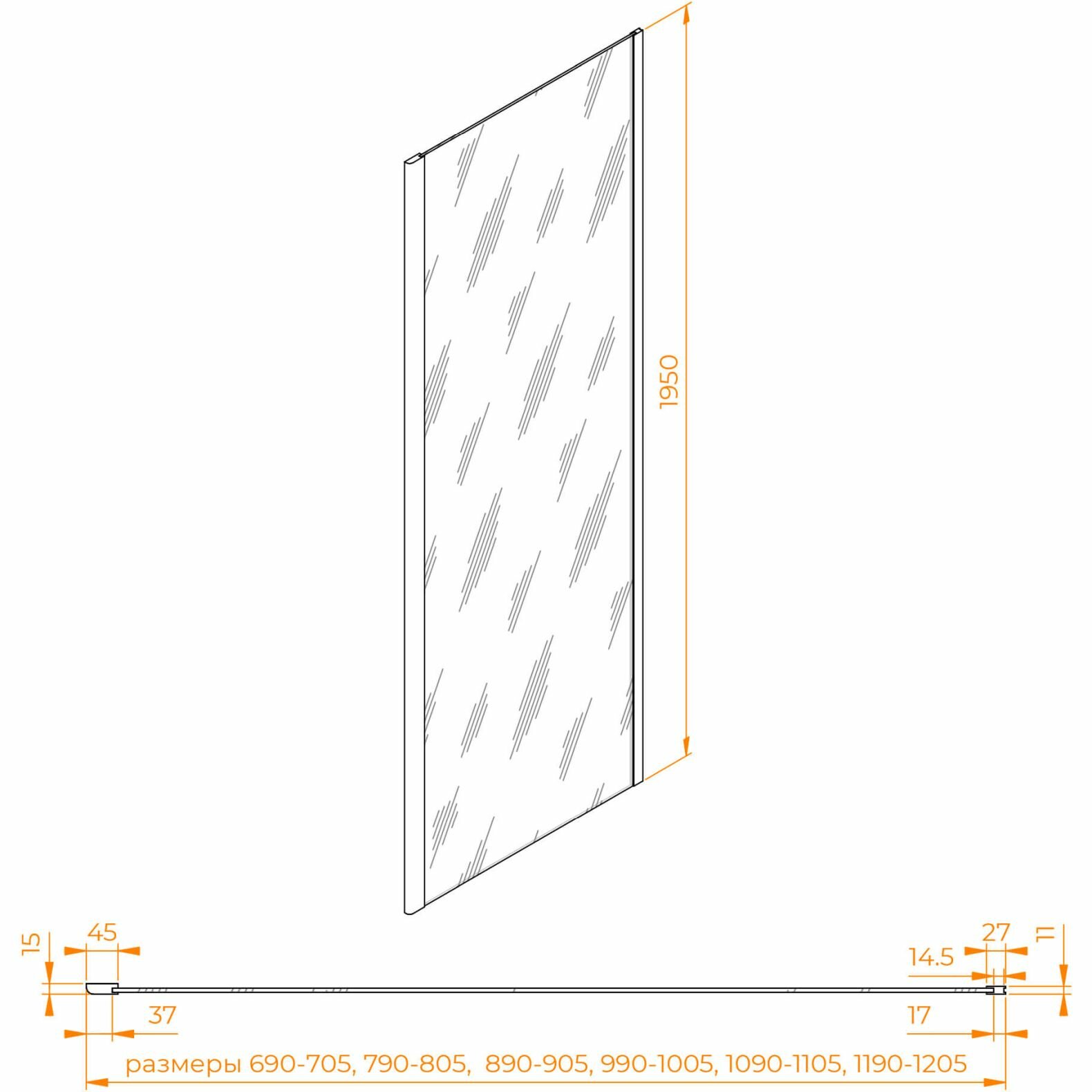 - Размеры с диапазоном регулировок (ШxВ): (890-900)x1950 мм.
