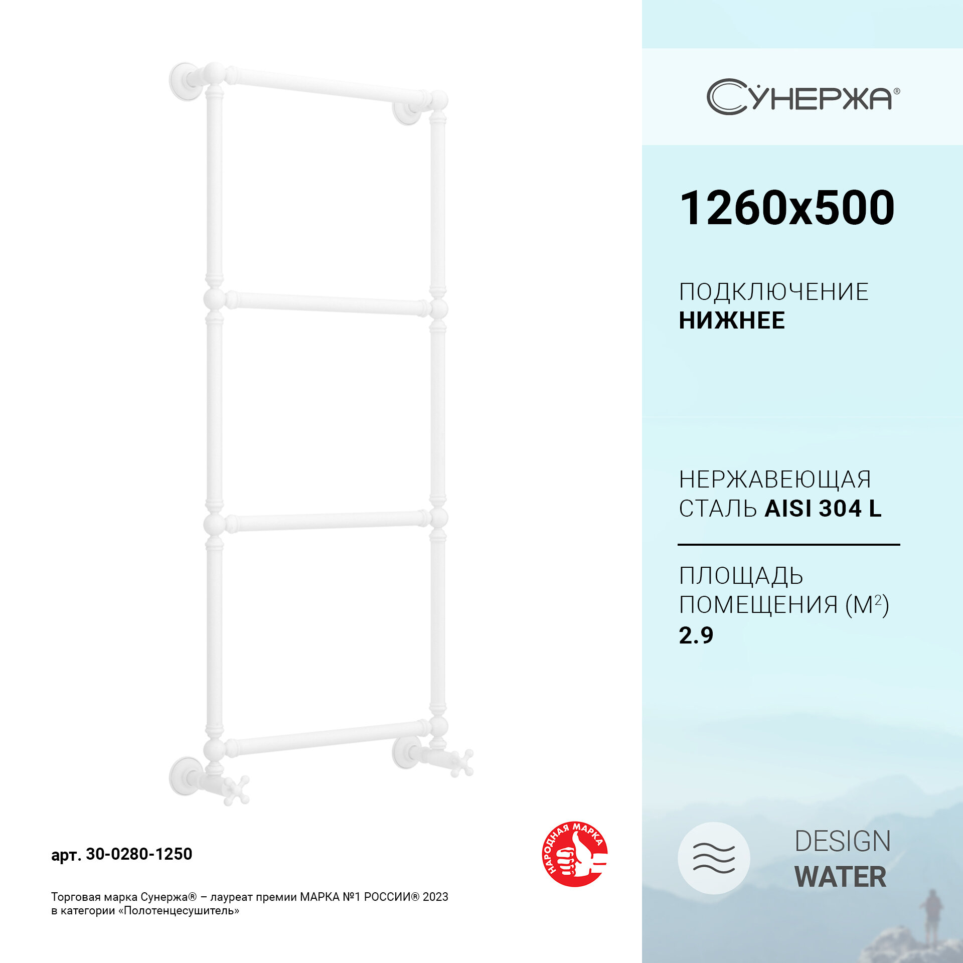 Водяной полотенцесушитель Сунержа Ренессанс 1304 126х50 белый (12-0280-1250)