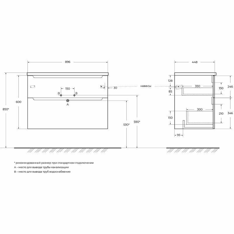 - Габариты корпуса тумбы (ШхВхГ): 896х600х448 мм.