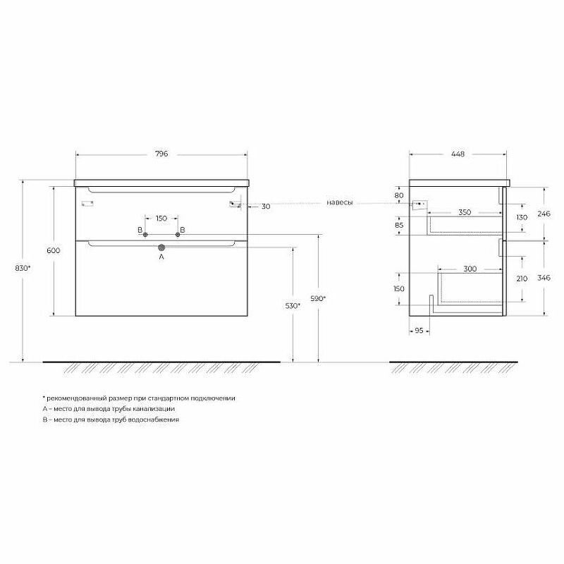Монтаж: на стену. Ширина, см: 80 см. Глубина, см: 45.5 см. Высота, см: 60 см. Материал раковины: керамика. Цвет раковины: белый. Система хранения: 2 выдвижных ящика. Дополнительная информация: база оснащена доводчиками, ручки скрыты в плоскости фасада, раковина сифоном не комплектуется. Раковина, зеркало и пенал приобретаются отдельно (смотрите в дополнительной комплектации).