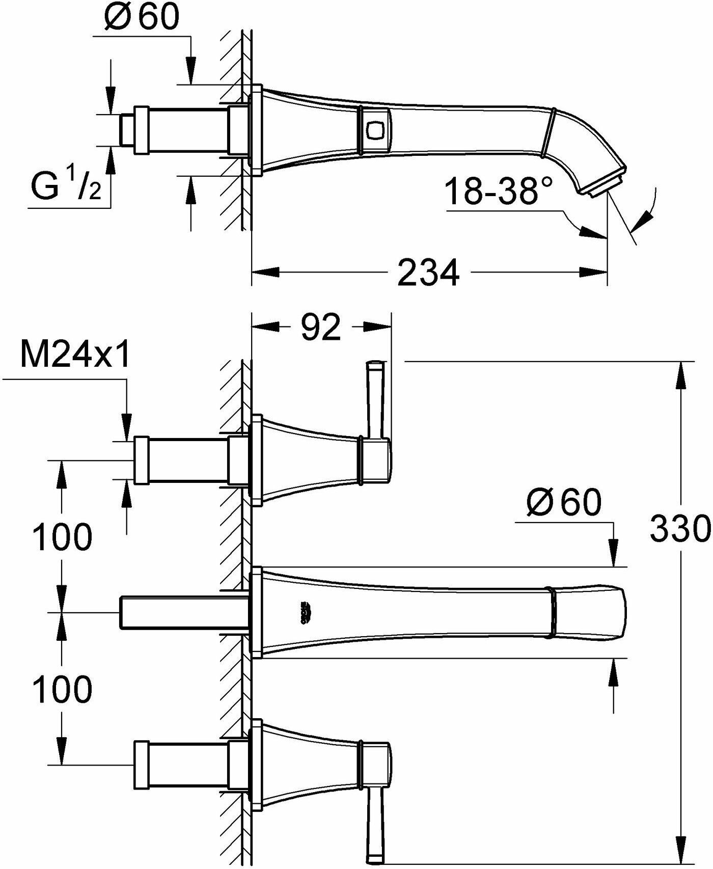 Смеситель Grohe Grandera 20415000 для раковины Grandera 20415000 для раковины на 3 отверстия, настенный монтаж, вынос 234 мм