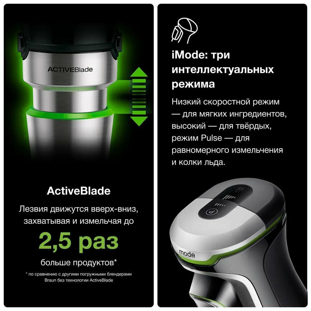 Флагман Braun MultiQuick 9 стал еще лучше. Представляем новые передовые функции, такие как технология Active PowerDrive, повышающая производительность до 60 %* благодаря двигателю мощностью 1200 Вт, и технология ActiveBlade, которая перемещается вверх и вниз, чтобы легко превращать самые твердые ингредиенты в самые вкусные творения. А благодаря новой технологии imode вы можете выбирать между 3 скоростными режимами