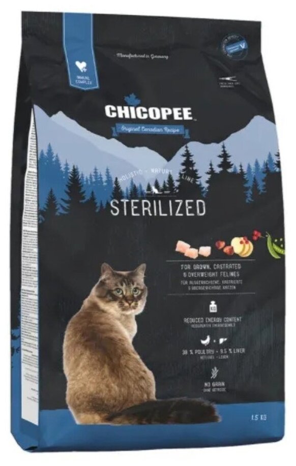 Chicopee HNL Cat Sterilized сухой корм для стерилизованных кошек. Полноценное питание для взрослых кошек и котов, которые склонны к избыточному весу, в том числе из-за кастрации. Кастрированные животные нуждаются в менее калорийном корме с большим количеством клетчатки (сырая клетчатка), которая обеспечивает быстрое насыщение и позволяет избегать увеличения веса (контроль веса). При этом снижается нагрузка на суставы и кости животного. Формула содержит большое количество мяса птицы (38% свежее и дегидратированное), которое является легкоусваиваемым и высококачественным источником белка. Содержание в составе 9,5% печени (свежей и сушеной) добавляет особый вкус рациону.