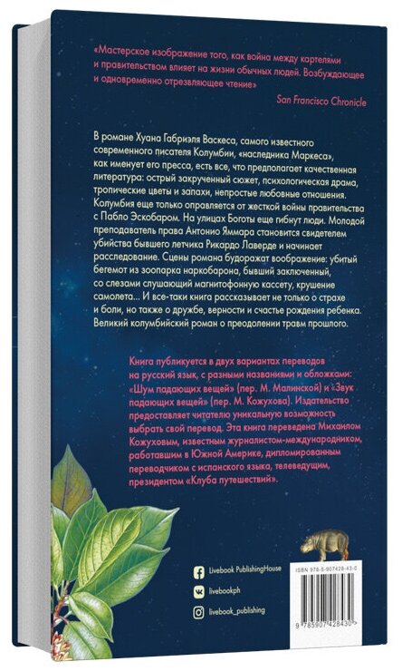 Сцены романа будоражат воображение: убитый бегемот из зоопарка наркобарона, бывший заключенный, со слезами слушающий магнитофонную кассету, крушение самолета... И все-таки книга рассказывает не только о страхе и боли, но также о дружбе, верности и счастье рождения ребенка. Великий колумбийский роман о преодолении травм прошлого.