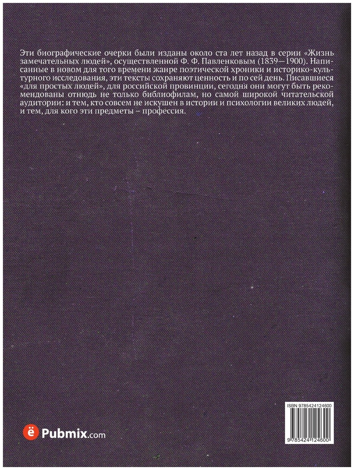 Эти биографические очерки были изданы около ста лет назад в серии «Жизнь замечательных людей», осуществленной Ф. Ф. Павленковым (1839—1900). Написанные в новом для того времени жанре поэтической хроники и историко-культурного исследования, эти тексты сохраняют ценность и по сей день. Писавшиеся «для простых людей», для российской провинции, сегодня они могут быть рекомендованы отнюдь не только библиофилам, но самой широкой читательской аудитории: и тем, кто совсем не искушен в истории и психологии великих людей, и тем, для кого эти предметы – профессия.