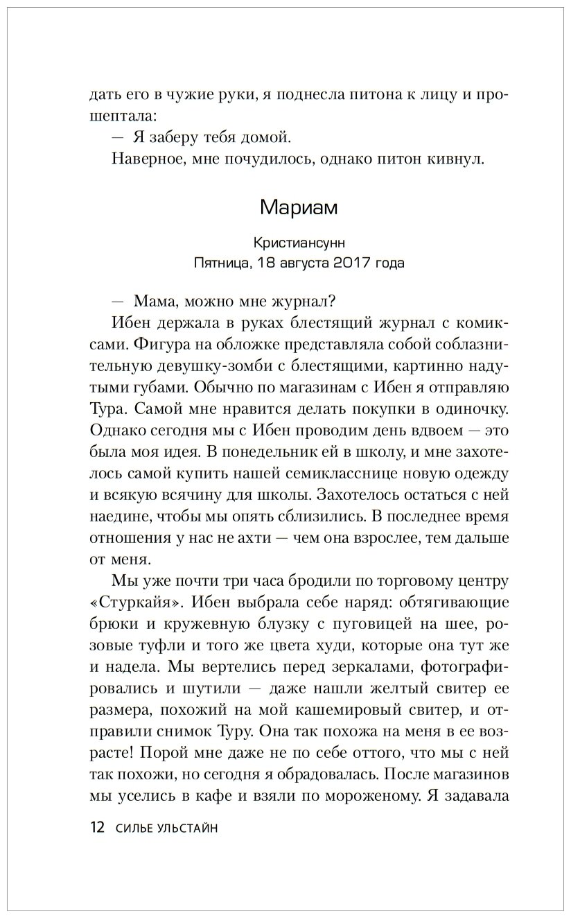 Для меня тайну в книге представляет не сам сюжет об исчезновении девочки-подростка, а то, как связаны между собой персонажи, как пересекаются их временные линии и как они меняются. Были мысли, что я читаю повествование от лица одного и того же персонажа, который сильно изменился, сменил всё, включая свое имя. Настолько таинственным получается сюжет. Это делает книгу еще более особенной и мощной. Я знаю, что это первый роман Cилье Ульстайн, и мне так понравилось, что я бы еще что-нибудь прочитала в этом духе. Отличный триллер,от которого мурашки по коже.
