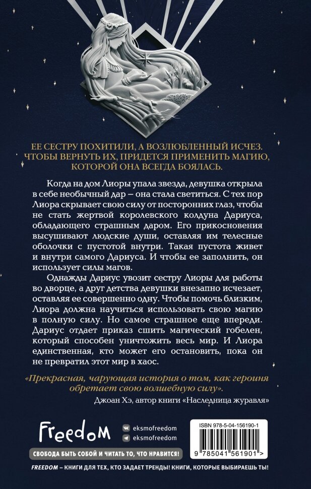 Когда на дом Лиоры упала звезда, девушка открыла в себе необычный дар - она стала светиться. С тех пор Лиора скрывает свою силу от посторонних глаз, чтобы не стать жертвой королевского колдуна Дариуса, обладающего страшным даром. Его прикосновения высушивают людские души, оставляя им телесные оболочки с пустотой внутри. Такая пустота живет и внутри самого Дариуса. И чтобы ее заполнить, он использует волшебные силы магов.