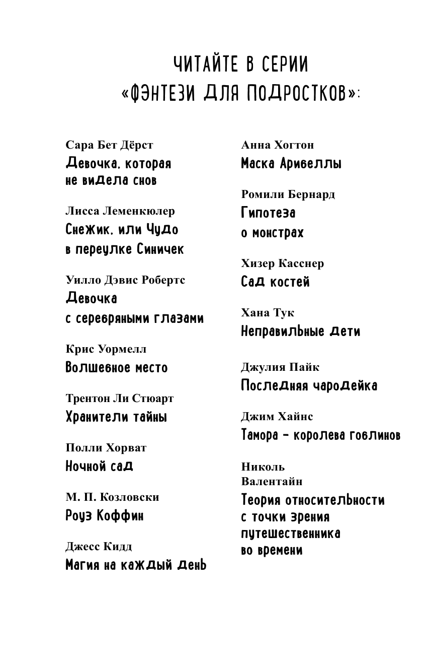 Эта мрачная, загадочная и уникальная атмосфера понравится не только детям, но и более взрослому поколению)) Отдельно, я хочу сказать, насколько круты иллюстрации. Вся концепция книги очень напоминает творчество Тима Бертона и определенно придётся по вкусу его поклонникам. Читается текст просто. Крупный шрифт не заставит напрягать зрение. А само приключение заставит отвлечься от повседневности.