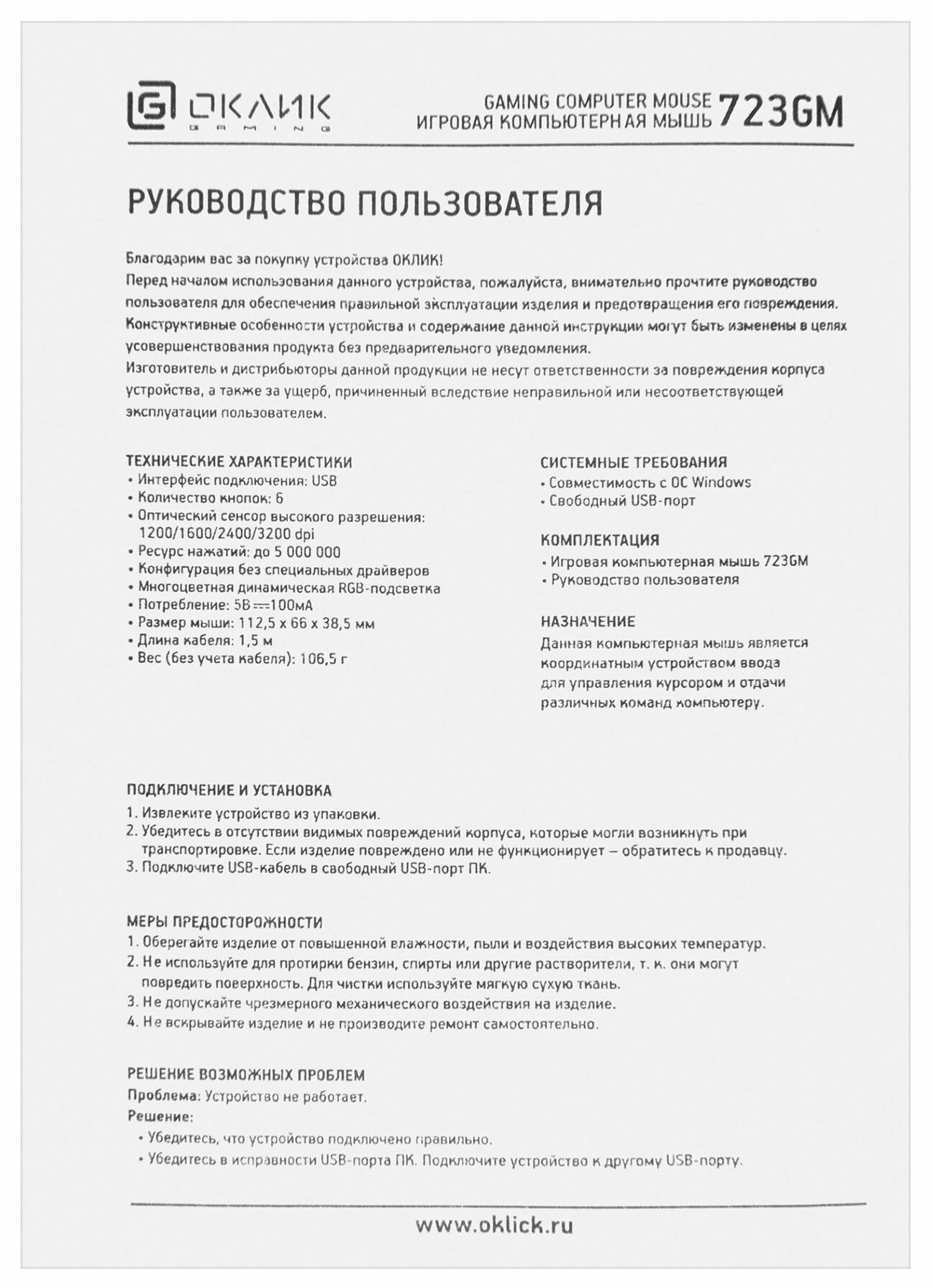 | Вес мыши | 106.5 г (без учета кабеля) |
