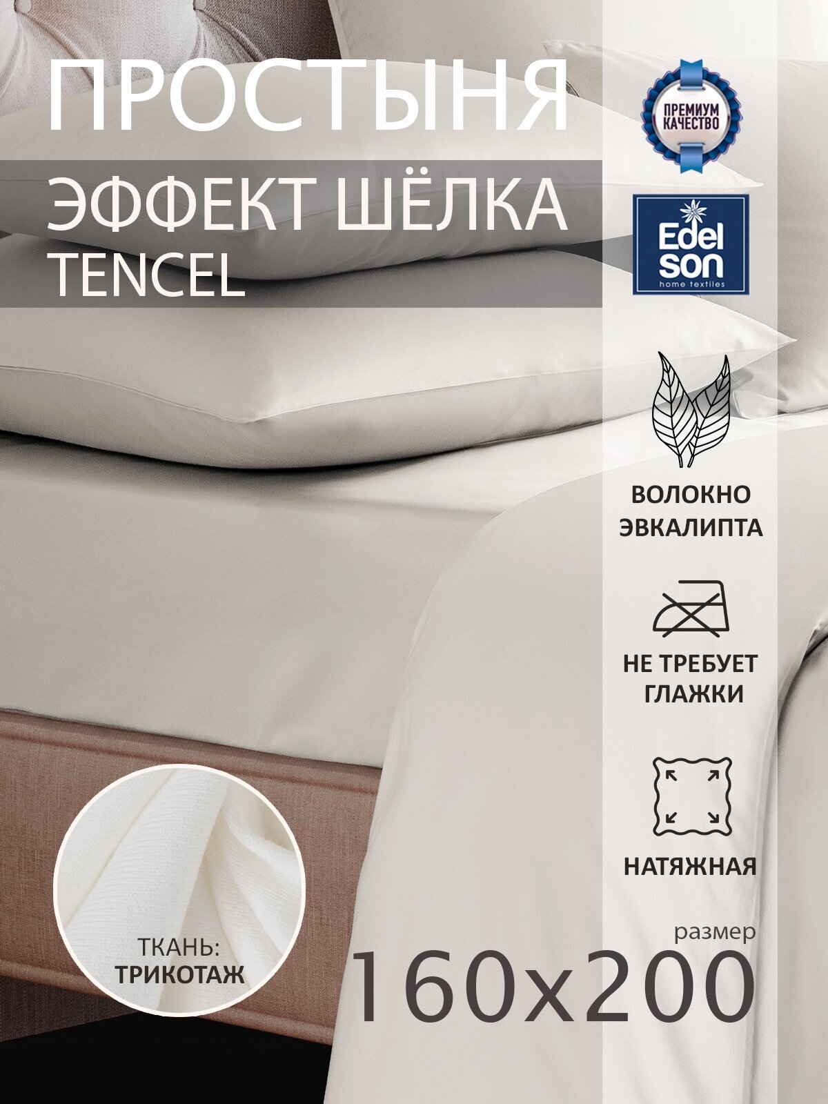 Простыня Edelson натяжная с резинкой по периметру, рекомендована для матрасов высотой до 30 см. Ткань трикотаж, состав: 50% хлопок, 50% тенсель. Тенсель – это натуральная ткань, в процессе производства которой используют эвкалиптовые волокна. Внешне и на ощупь такое полотно немного напоминает шелк. Главное преимущество такого постельного белья состоит в том, что это качественный натуральный материал, не вызывает абсолютно никаких аллергических реакций. Постельное белье из этого натурального материала служит очень долго и совершенно не теряет своих качеств с годами. И еще одно преимущество ткани заключается в том, что благодаря натуральным волокнам в таком постельном белье не появляются и не размножаются различные микроорганизмы. Даже спустя годы, в таком белье не заводится пылевой клещ и это еще один существенный плюс. Ткань отличается повышенной прочностью и эластичностью, совершенно не нуждается в глажке, так как не мнется абсолютно.