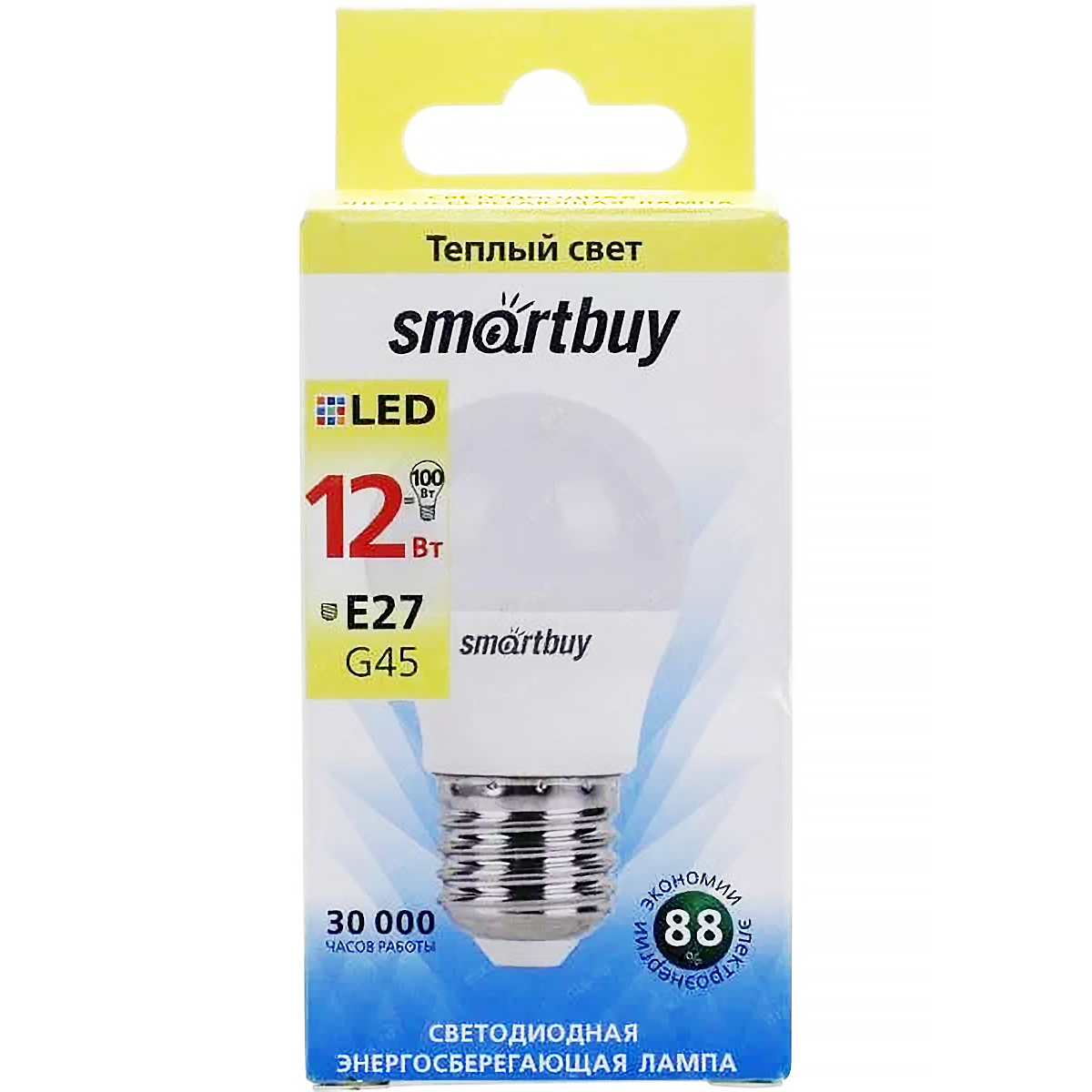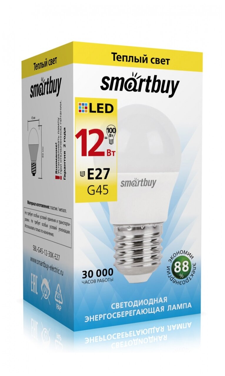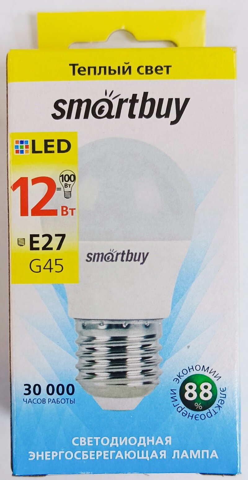 лампа светодиодная smartbuy led sbl-g45-12-30k-e27 е27 шар 12вт 3000к