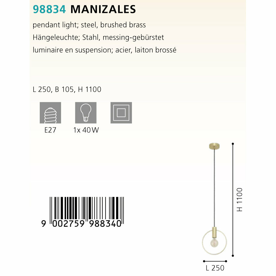 | Номенклатура | 98834 Подвесной потолочный светильник (люстра) MANIZALES, 1Х40W, E27, L250, B105, H1100, сталь, матовая латунь |