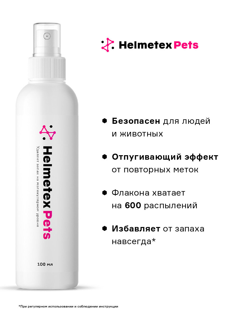Нейтрализатор запаха Helmetex Pets - не имеет аналогов в Мире. Средство от запаха эффективно избавляет от запаха кошачьей мочи, кошачьих меток, запаха псины на предметах мебели и интерьера и других неприятных запахов от домашних животных на молекулярном уровне. Поглотитель запаха или ликвидатор запаха Helmetex Pets удаляет источник запаха с различных изделий и поверхностей, включая мягкую мебель и ковры. Helmetex работает, как уничтожитель запаха, а не как освежитель воздуха. Обладает антибактериальным и дезинфицирующим действием. Подходит для обработки любых материалов: текстиль, поролон, натуральная и искусственная кожа, замша, пластик и т.д. Важно: в связи с возможным отпугивающим эффектом, не используйте данное средство для устранения запахов кошачьего туалета/лотка!
