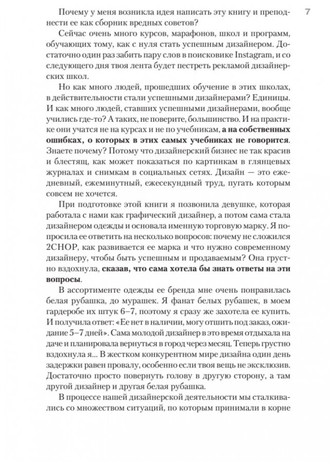 Интересный подход выбран в этой книге. Уже привычные методы по типу "Сто советов, как стать успешным" и. т. д. здесь не работают. Это очень актуально учиться на реальных ошибках других, тем более, когда дела касается бизнеса. Поэтому, я считаю, что даже, если вы не собираетесь в ближайшем будущем становиться дизайнером одежды, вам все равно стоит прочитать эту книгу, даже просто для общего ознакомления.