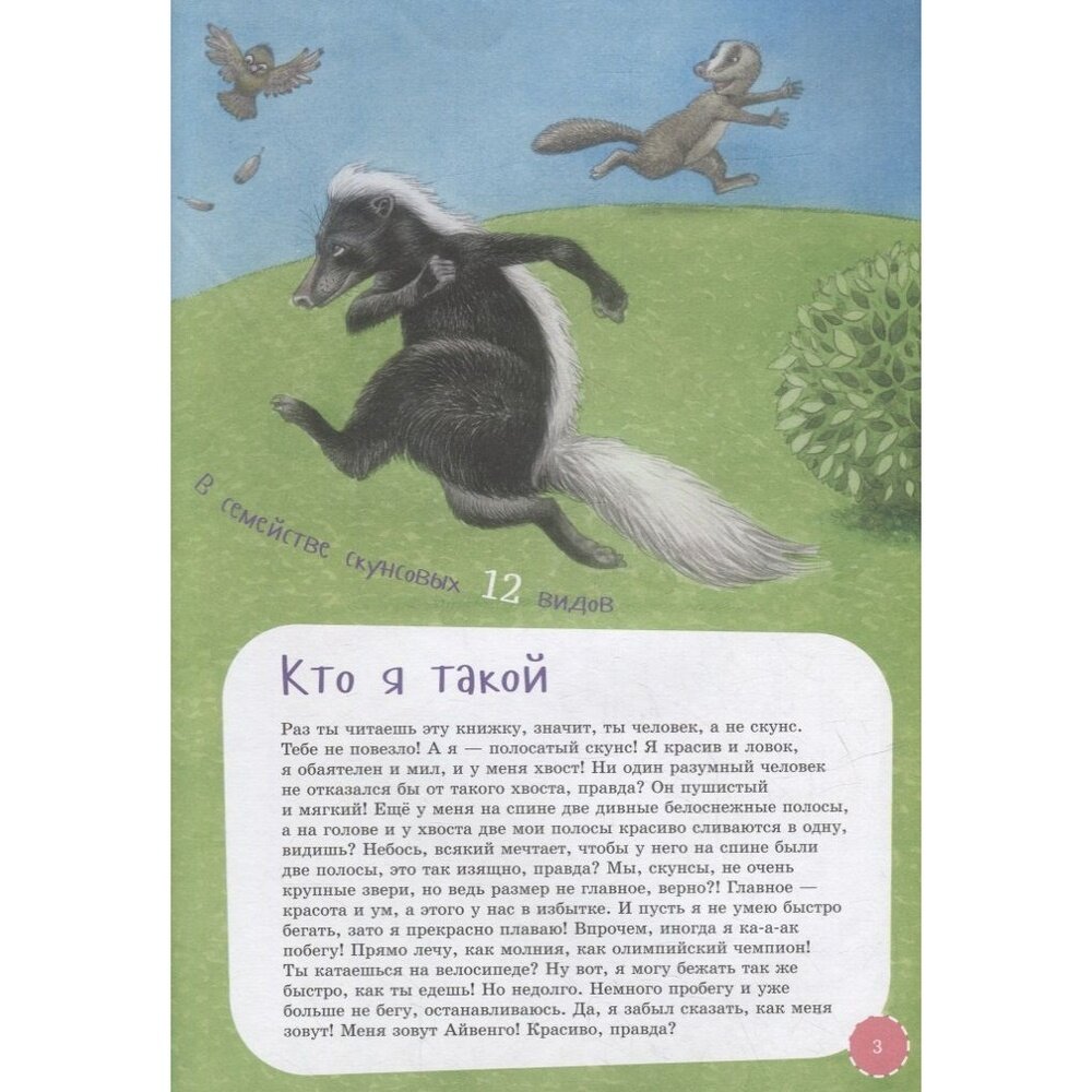 Книги данной серии рассказывают детям про животных в игровой форме и от первого лица. Сын выбрал про скунса, ему очень интересен этот зверь и персонаж. Книга приятно удивила: очень красочная, просто невероятная, лёгкий язык, много интересной познавательной информации, плотные мелованный листы - сказка, а не книга. Формат довольно большой и вообще книга выглядит красиво