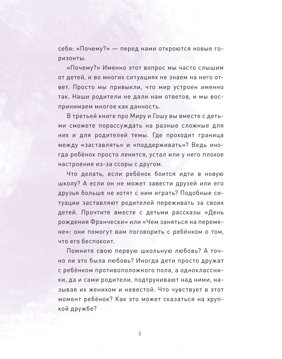Родители и дети часто не могут найти общий язык. Это связано с тем, что родители уверены в своей позиции, а дети ещё не обладают таким словарным запасом, чтобы объяснить, что они чувствуют и почему думают по-другому. Истории Миры и Гоши помогут вам и вашим детям поговорить на разные темы. Ребенок сможет сказать: «Именно это я имел ввиду», а вы ответить: «Да, теперь понимаю». И вы станете ближе друг другу. Именно эта близость формирует связь между вами, даёт возможность слышать и понимать.