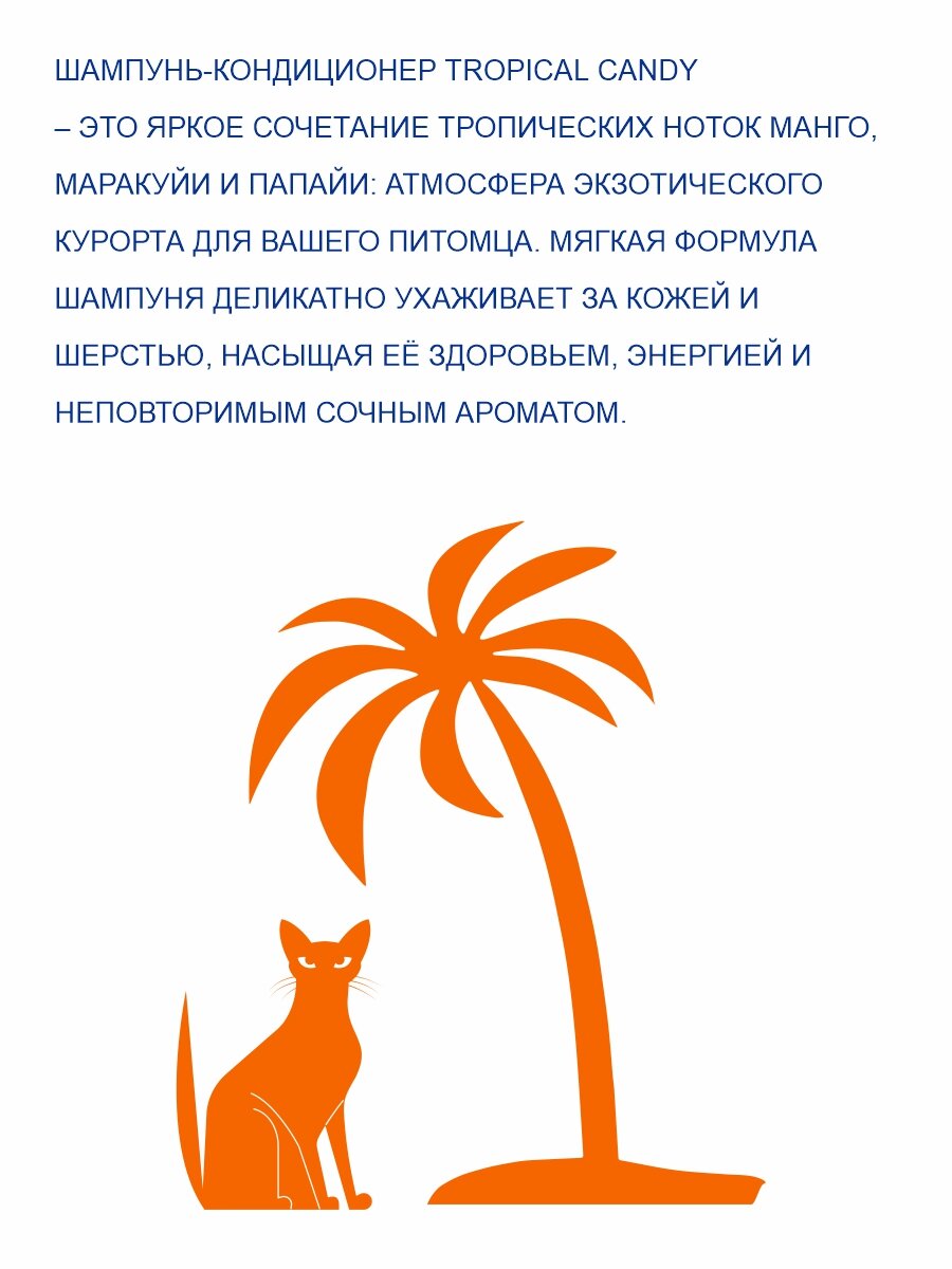 Изысканный уход для совершенного результата! Шампунь-кондиционер Tropical Candy – это яркое сочетание тропических ноток манго, маракуйи и папайи: атмосфера экзотического курорта для вашего питомца. Мягкая формула шампуня деликатно ухаживает за кожей и шерстью, насыщая ее здоровьем, энергией и неповторимым сочным ароматом. Шампунь-кондиционер глубоко проникает в структуру поврежденных волос шерсти, восстанавливает естественный уровень увлажненности, снижая пористость и делая шерсть гладкой и эластичной. Шампунь создает на поверхности кожи и шерсти покрытие, которое надолго обеспечивает защиту от вредных факторов окружающей среды. Провитамин В5 в составе шампуня оказывает заживляющее и противовоспалительное действие. Кондиционирующие добавки снимают и замедляют накопление статического электричества, облегчают расчесывание, предотвращают спутывание шерсти, придают дополнительный объем и блеск.