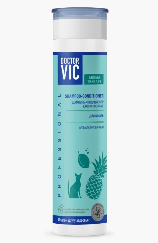 Шампунь-кондиционер для кошек Doctor VIC EXOTIC COCKTAIL, 250 мл. Шампунь-кондиционер exotic cocktail – это яркий микс ноток цитрусовых и манго: фруктовый заряд свежести и энергии для активной жизни Шампунь тщательно очистит кожу и шерсть кошки, а приятные фруктовые ароматы будут баловать вас ещё долгое время. Специальный состав шампуня-кондиционера обеспечивает глубокое очищение кожно-волосяного покрова, не раздражает кожу и поддерживает естественный уровень увлажнённости, защищая от пересушивания и от избыточной влаги. натуральные компоненты, входящие в состав шампуня, глубоко проникают в структуру повреждённых волос шерсти, снижая пористость и делая шерсть гладкой, эластичной и блестящей. Кератин и провитамин в5, входящий в состав шампуня-кондиционера, обладают заживляющим, противовоспалительным действием, ускоряют регенерацию тканей кожного покрова, защищают от неблагоприятных факторов окружающей среды, устраняют зуд.1. Шампунь можно использовать с водой любой жёсткости. 2. Кожно-волосяной покров животного обильно смочите тёплой водой. Небольшое количество шампуня равномерно распределите по всей поверхности тела животного, массируя до образования обильной пены. 3. Через 1-2 минуты смойте пену тёплой водой, шерсть просушите полотенцем или феном. В случае попадания в глаза обильно промойте их водой.Состав: aqua, sodium laureth sulfate, cocamidopropylbetain, cocamide dea, glycereth-2 cocoate, hydrolyzed keratin, polyquaternium-7, peg-40 hydrogenated castor oil, glyceryl monostearate, polyquaternium-10, glycol distearate, pantenol, benzisothiazolinone, methylisothiazolinone, disodium edta, citric acid, parfum.