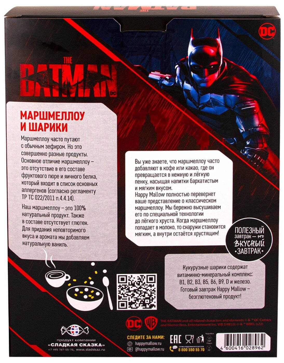 Сухой завтрак Happy Mallow Batman с маршмеллоу 240г – это 100% безглютеновый продукт, который непременно порадует не только детей, но и взрослых! В его состав входят кукурузные шарики, обогащенные витаминно-минеральным комплексом, и небольшие кусочки маршмеллоу, высушенные по особой технологии до легкого хруста. Маршмеллоу, в отличие от традиционного зефира, не содержит фруктово-ягодных пюре и яичного белка, способных вызывать аллергические реакции. Ингредиенты упакованы в отдельные металлизированные пакеты. В каждую упаковку вложены прозрачные стикеры, с помощью которых пакетики можно закрывать несколько раз. С приготовлением такого завтрака легко справится даже ребенок: просто насыпьте необходимое количество шариков и зефирок в тарелку, залейте молоком и перемешайте.