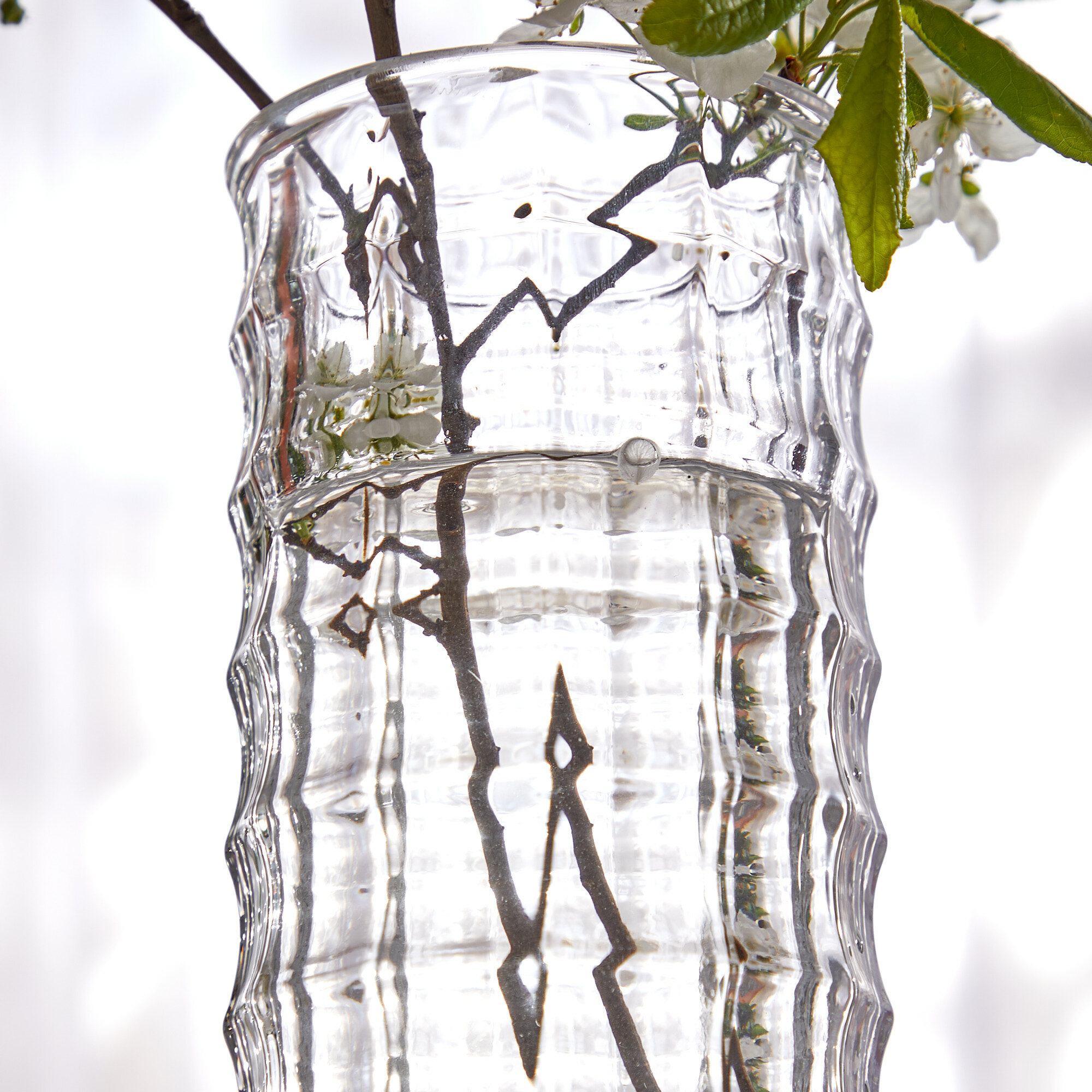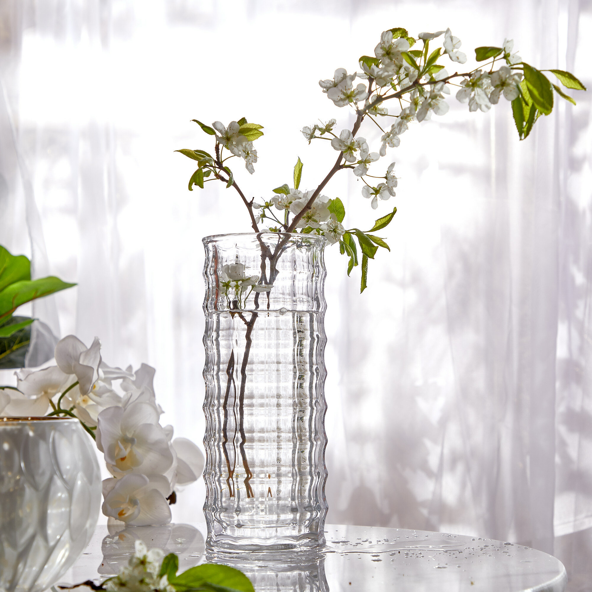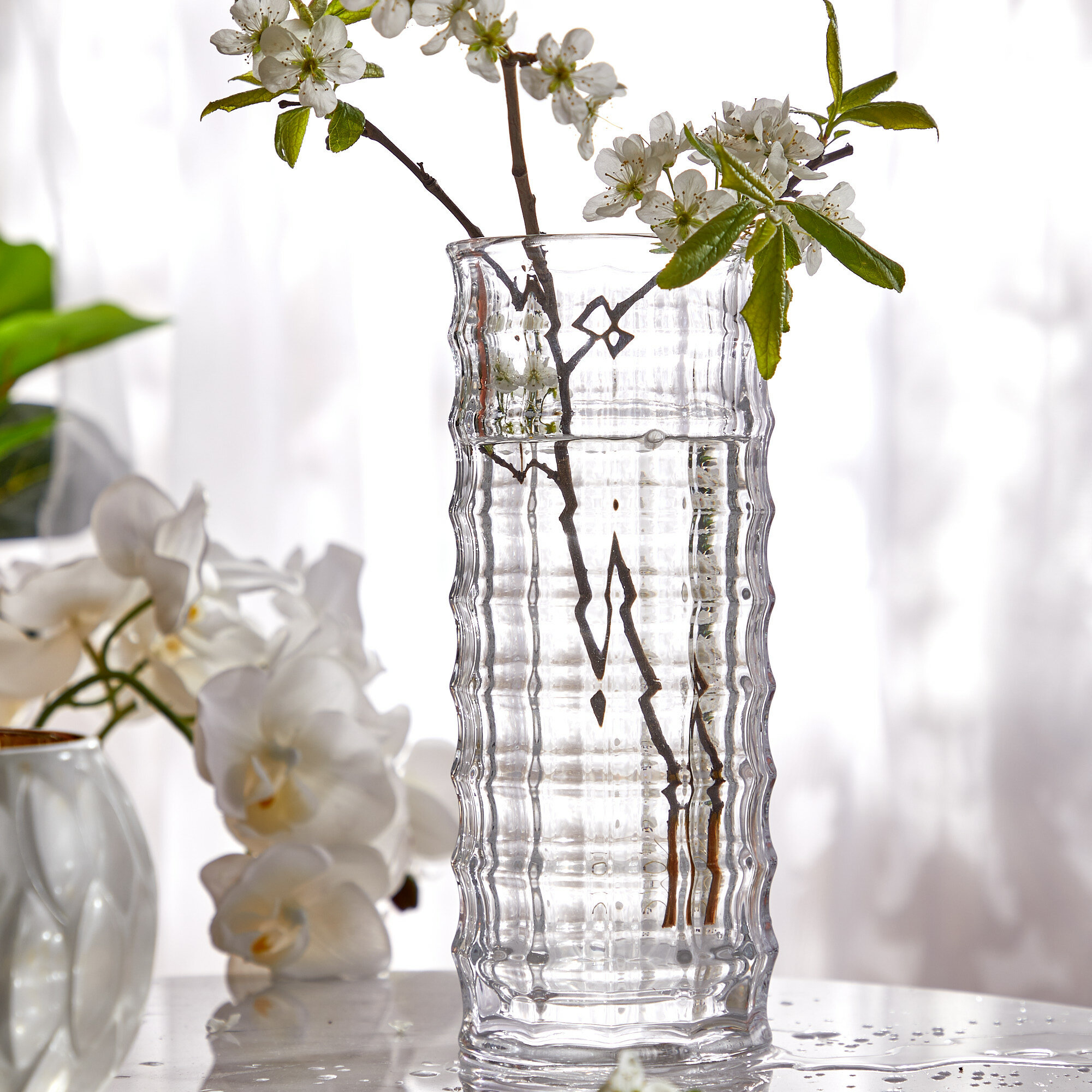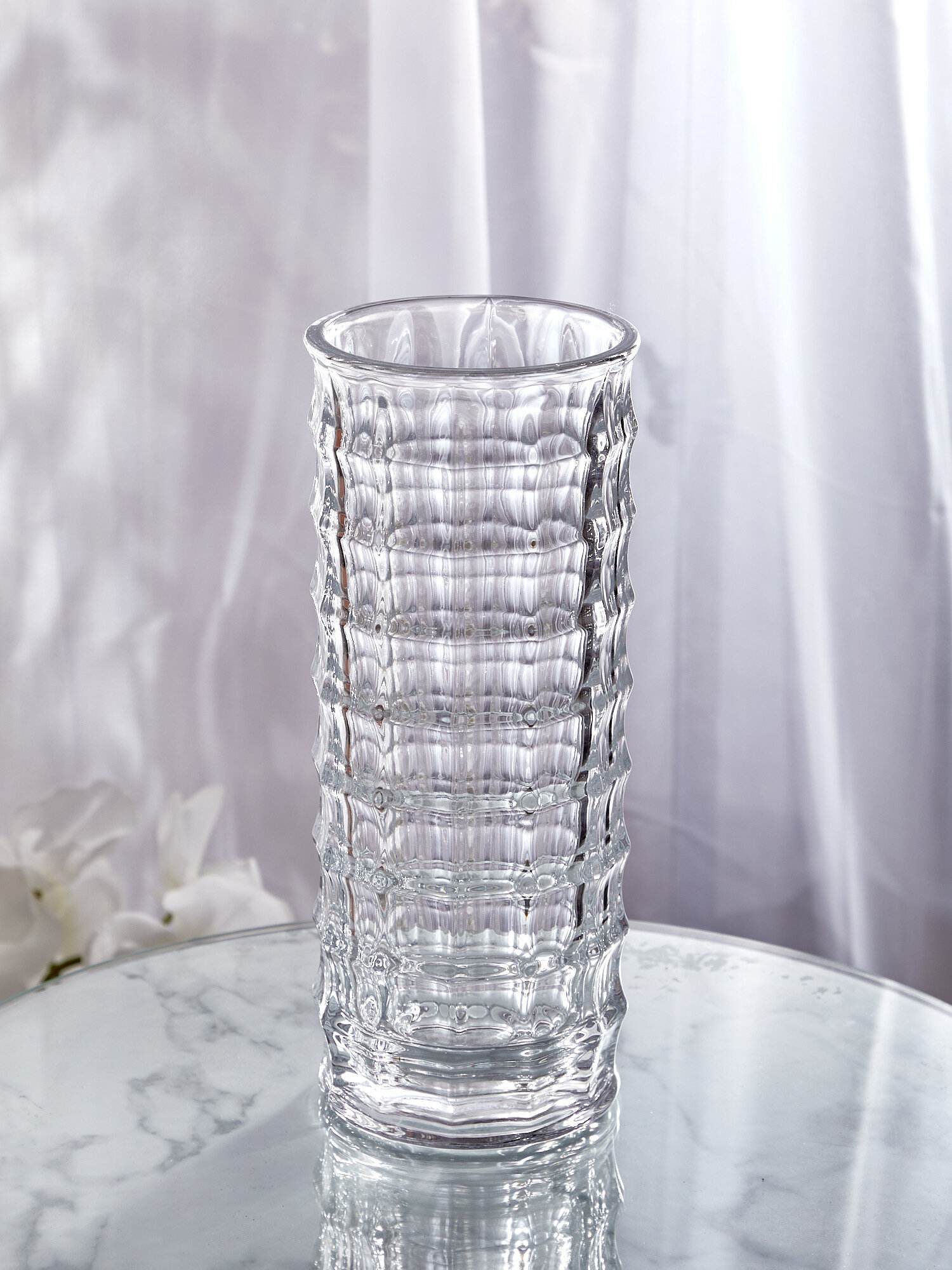 Классическая цилиндрическая стеклянная ваза с квадратным узором станет очаровательным дополнением к вашему интерьеру.