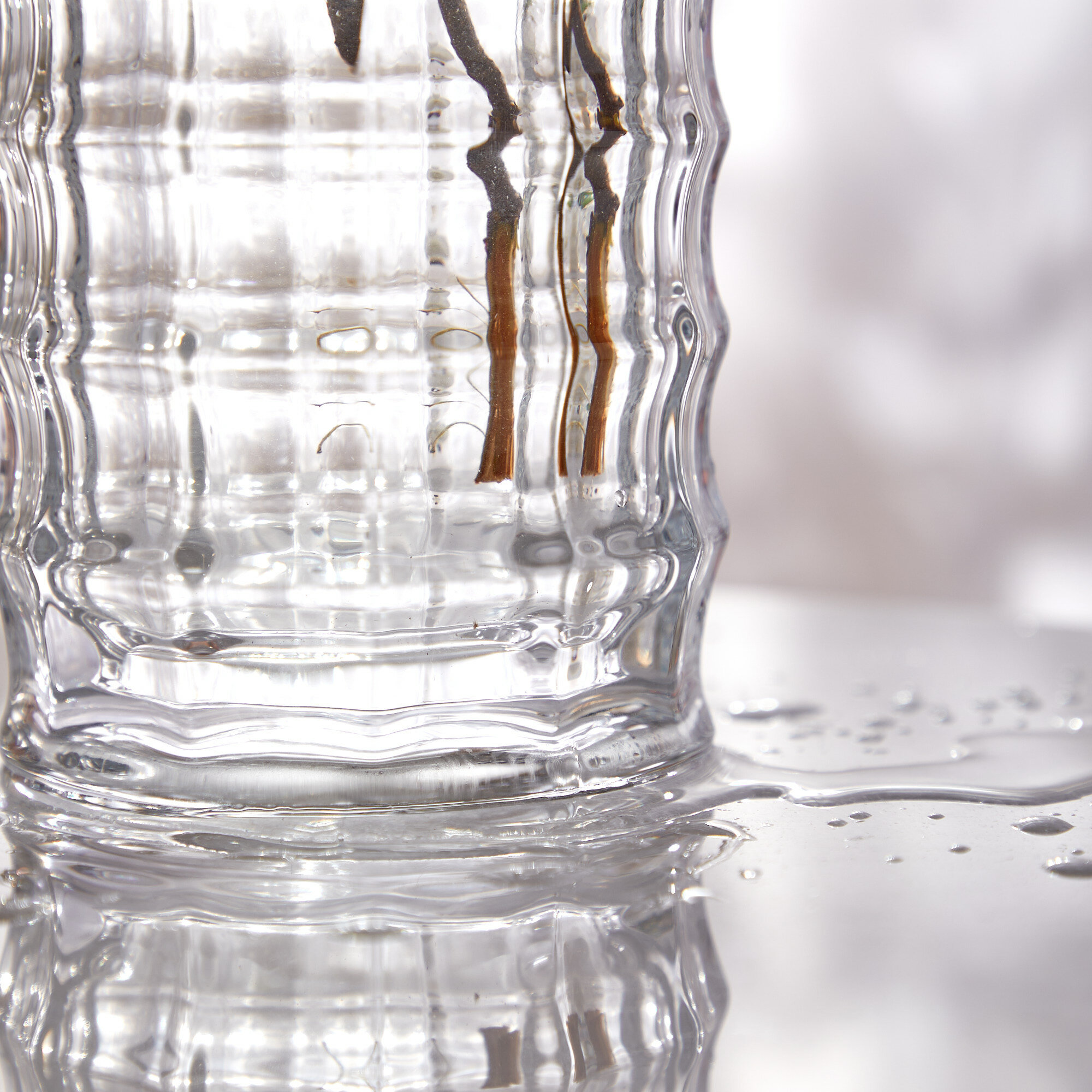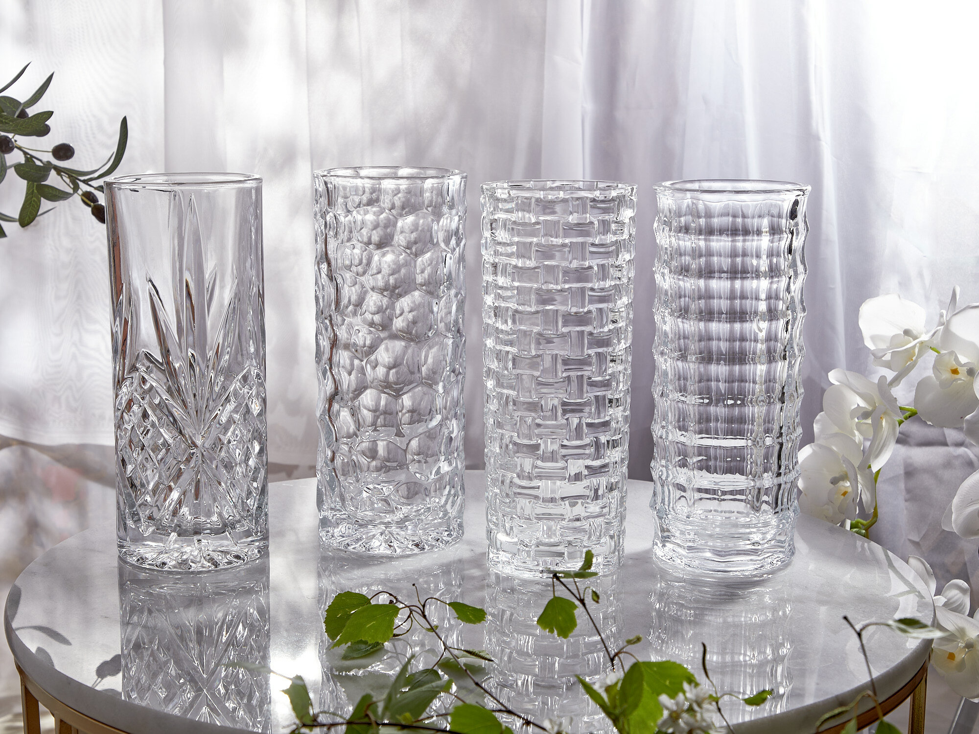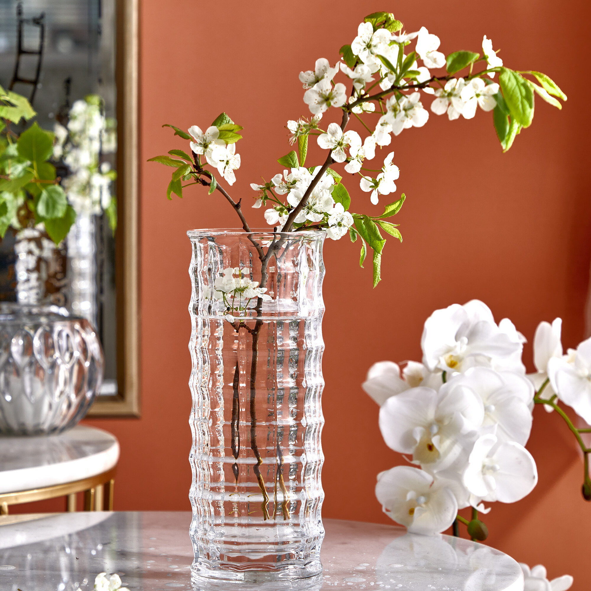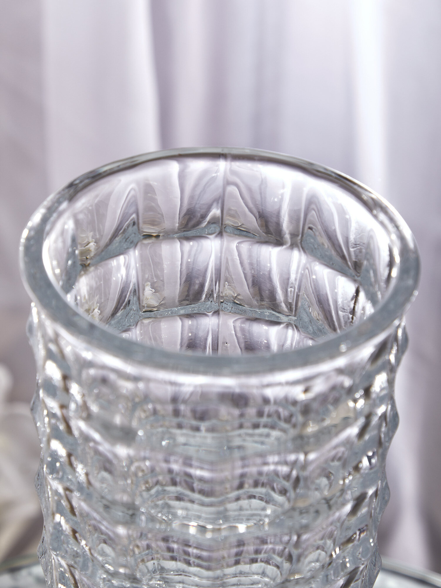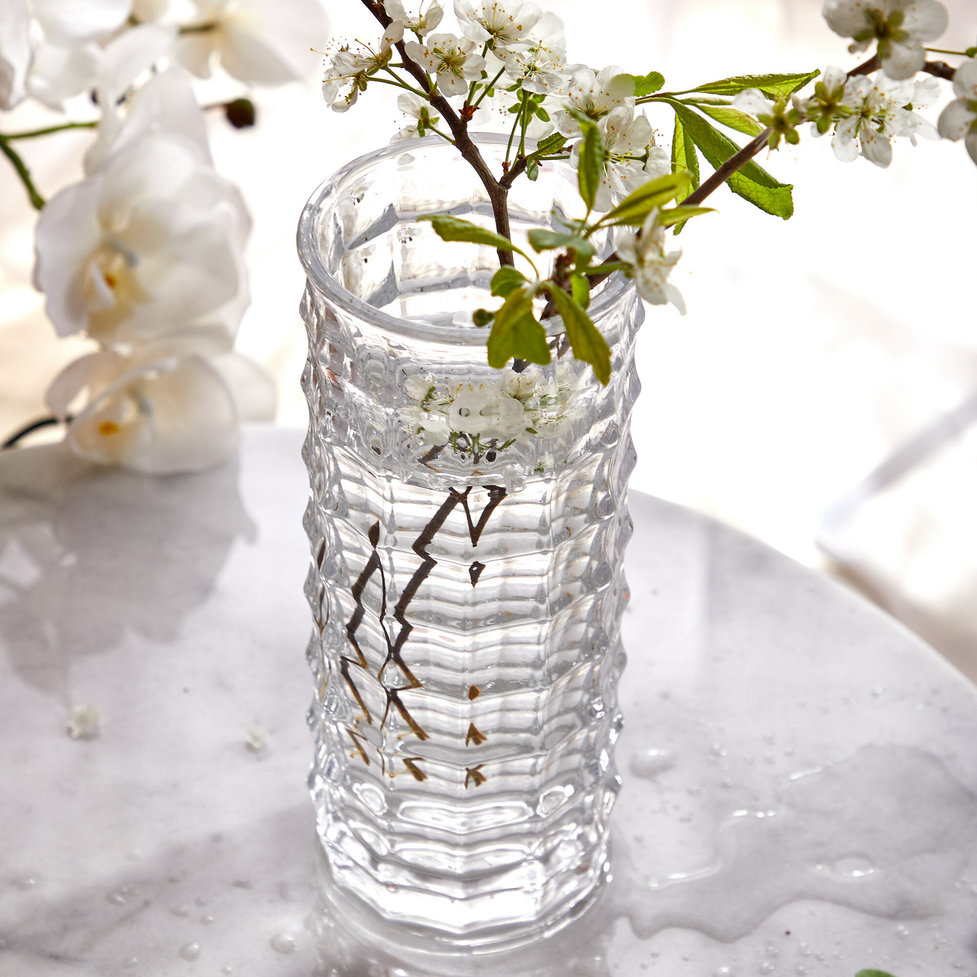 Классическая цилиндрическая стеклянная ваза с квадратным узором станет очаровательным дополнением к вашему интерьеру.