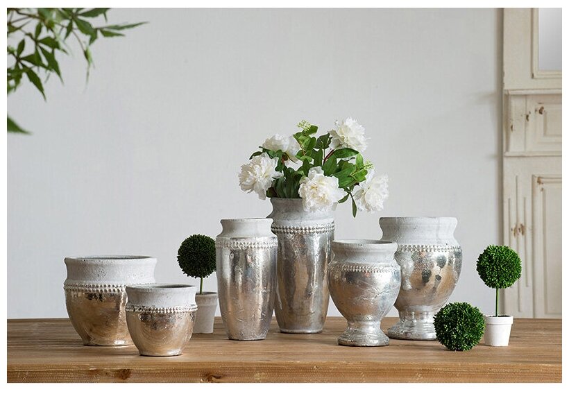 Ваза отличается захватывающим контрастом с прочной, бетонной керамикой и роскошной глянцевой, серебристой отделкой. Верхнее декоративное кольцо с текстурой. Страна дизайна: США.