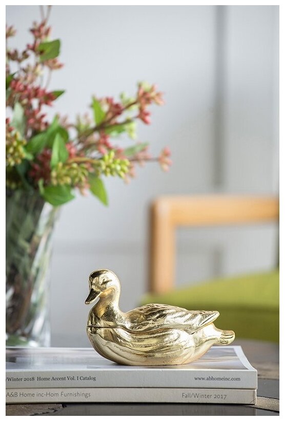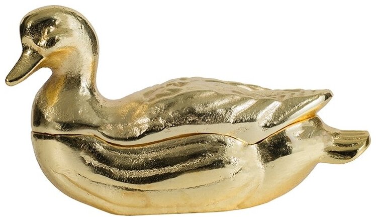 Придайте необычный вид своему интерьеру с помощью этой шкатулки для мелочей в форме утки. Изготовленная из алюминия с полированным золотом, эта статуэтка станет декоративным акцентом на любой столешнице или полке, как очаровательное дополнение любого дома, от традиционного до современного.
