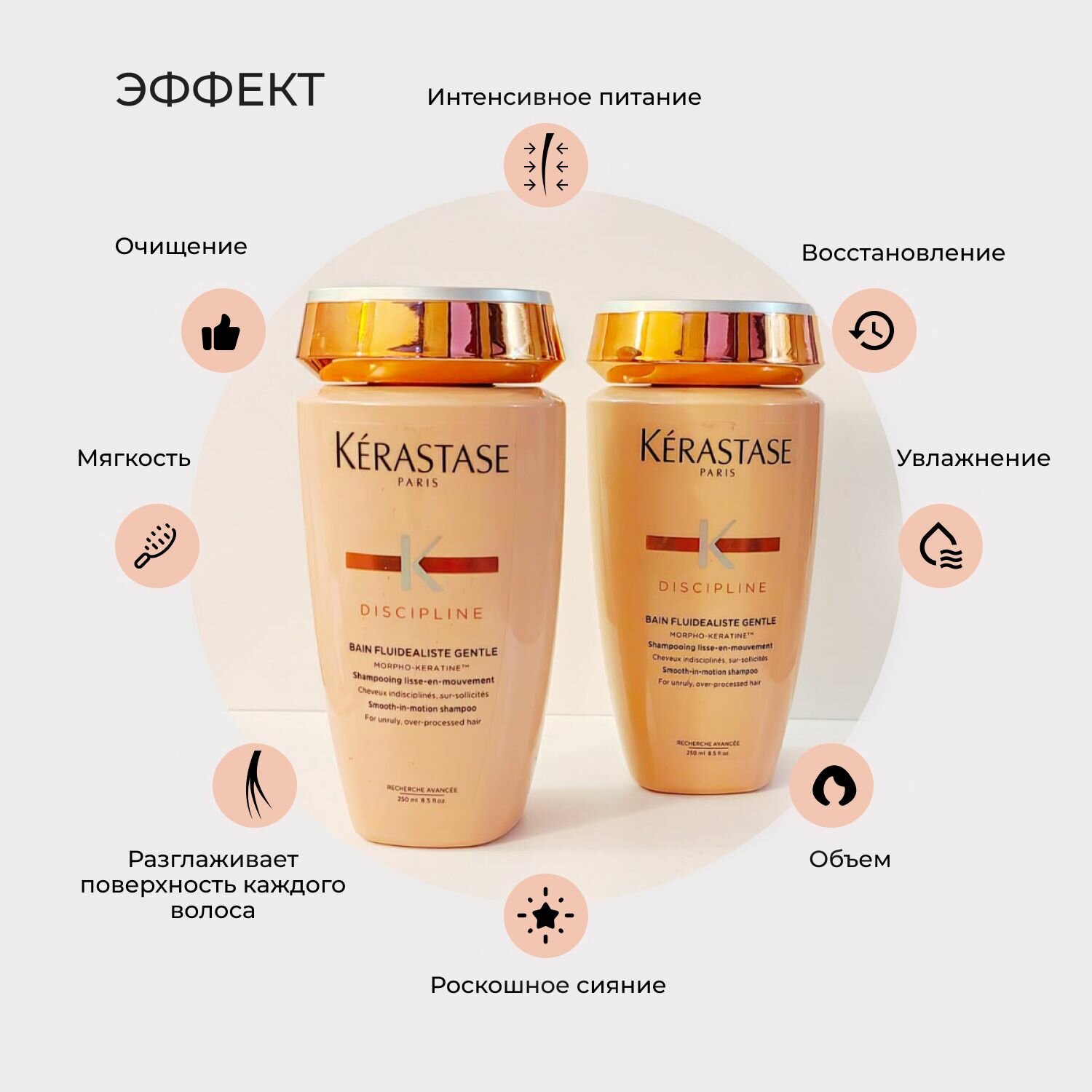 Шампунь-ванна Discipline Fluidealiste без сульфатов мягко и деликатно очистит волосы и кожу головы без раздражения. Он легко «укротит» даже самые поврежденные, капризные и постоянно окрашиваемые волосы, не травмируя их. Средство придаёт мягкость и гладкость, наполняет необходимой влагой. Волосы становятся более эластичными и гибкими, а также не доставляют проблем при расчёсывании.