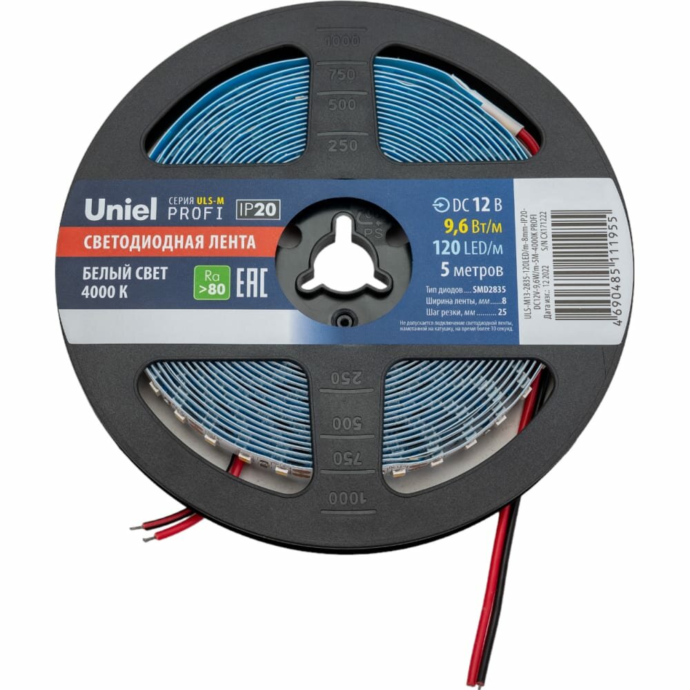 Код производителя: ULS-M13-2835-120LED/m-8mm-IP20-DC12V-9, 6W/m-5M-4000K PROFI катушка в герметичной упаковке