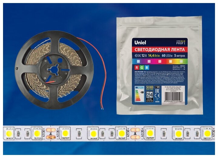 Код производителя: ULS-M25-5050-60LED/m-10mm-IP20-DC12V-14, 4W/m-5M-RGB PROFI катушка в герметичной упаковке
