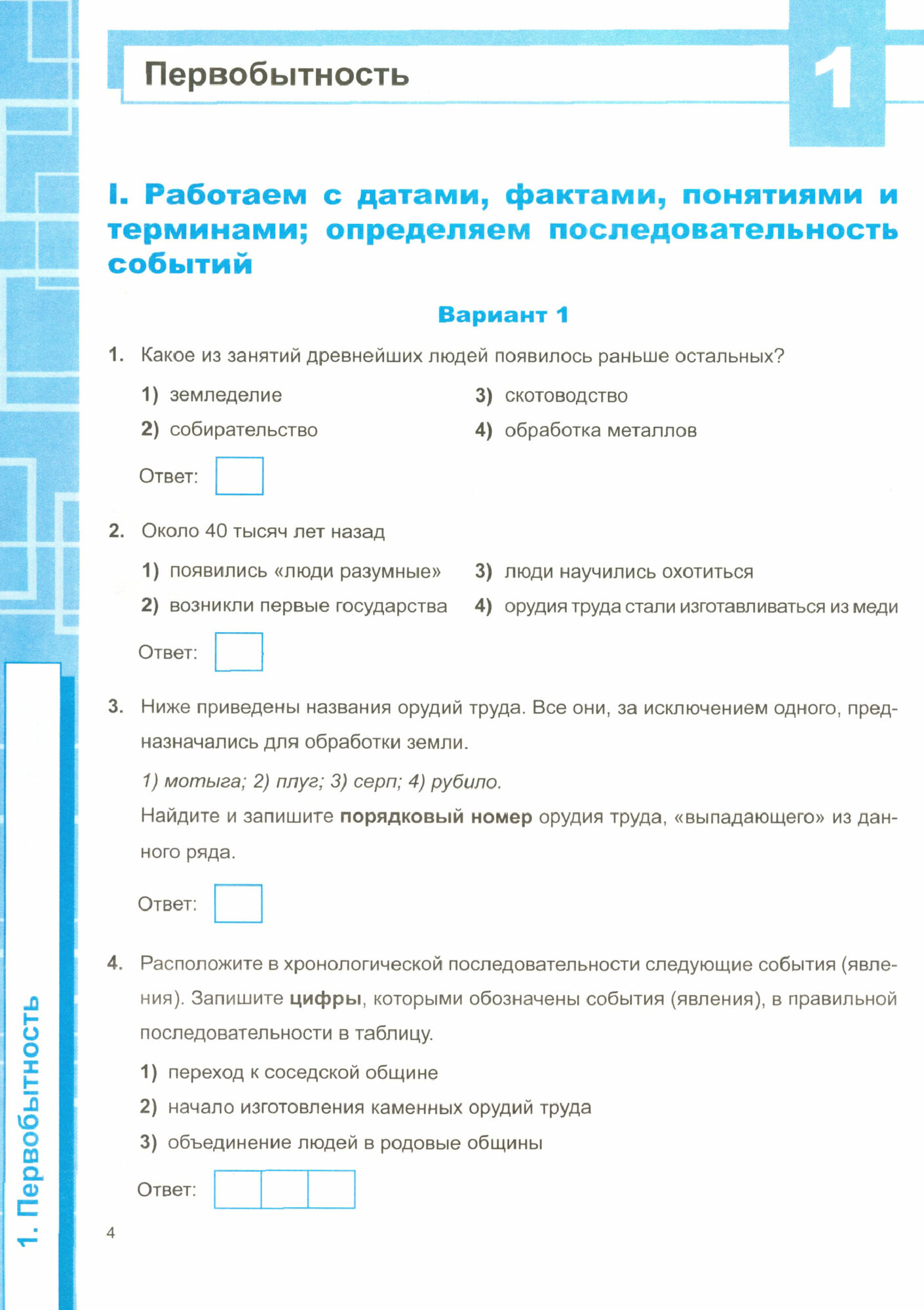 Для формирования этих умений тетрадь предлагает задания на знание хронологии; исторических фактов, работу с фактами; работу с историческими источниками; поиск и выделение необходимой информации; описание (реконструкция); анализ (объяснение); работу с версиями, оценками; творческие задания.