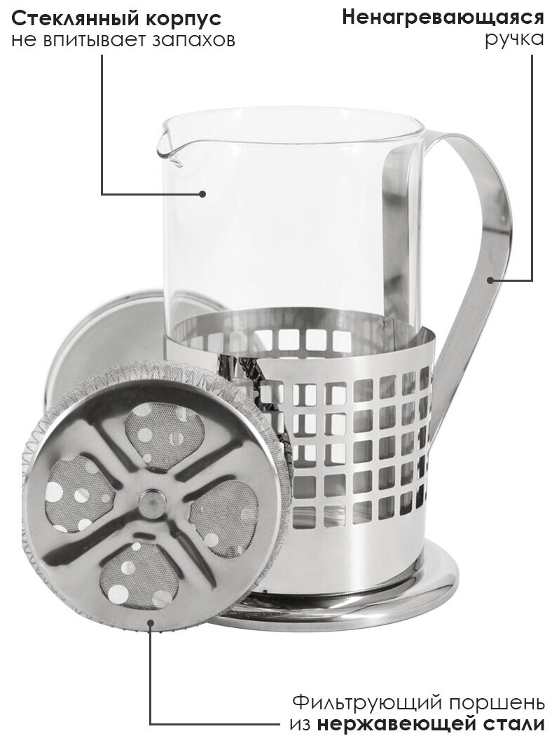 Френч-пресс Rosenberg изготовлен из высококачественной нержавеющей стали и термостойкого стекла. Удобная ненагревающаяся ручка. Фильтр-поршень из нержавеющей стали выполнен по технологии ″press-up″ для обеспечения равномерной циркуляции воды. Засыпая чайную заварку или кофе под фильтр, заливая горячей водой, вы получаете ароматный напиток с оптимальной крепостью и насыщенностью.