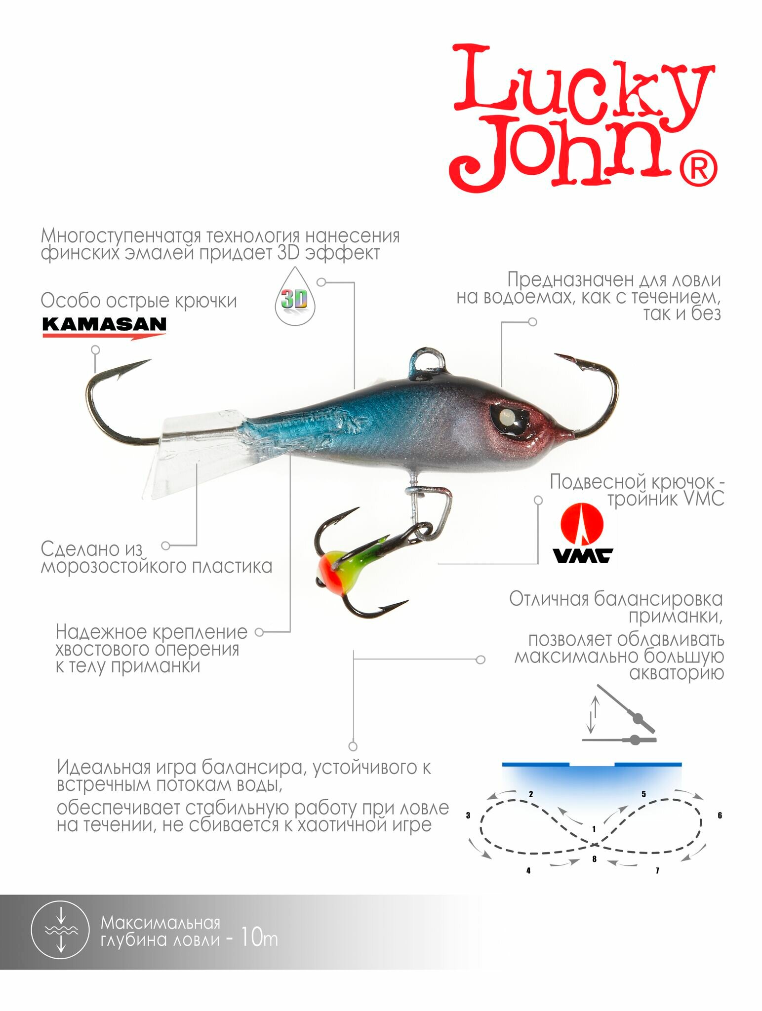 Вес: 22 г Тройник: №10, Есть Длина тела: 40 мм Длина общая с хвостом: 50 мм Страна производства: Латвия Балансир Lucky John BALTIC - тяжелая приманка для ловли на глубоких водоемах, как с течением, так и без него. Это тяжелый балансир, выполненный в необычной форме «шед» (компактный, объемный и немного сплюснутый с боков). Хвостовое оперение балансира может быть красным или прозрачным, изготовлено из морозостойкого пластика и приклеено к телу приманки суперпрочным клеем. Приманка изготовлена из прочных, стойких материалов. Особенности: - Передний и задний крючок Kamasan - Нижний крючок VMC *цвет тройника может отличаться от фотографии