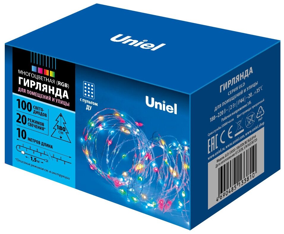Гирлянда светодиодная ULD-S1000-100/DTA/RC RGB IP44 - продукт известной компании Uniel (Китай). Имеет максимальную мощность 3.6 Вт. Отлично подойдет для таких мест, как гостиная, кафе, спальня, офис, магазин.
