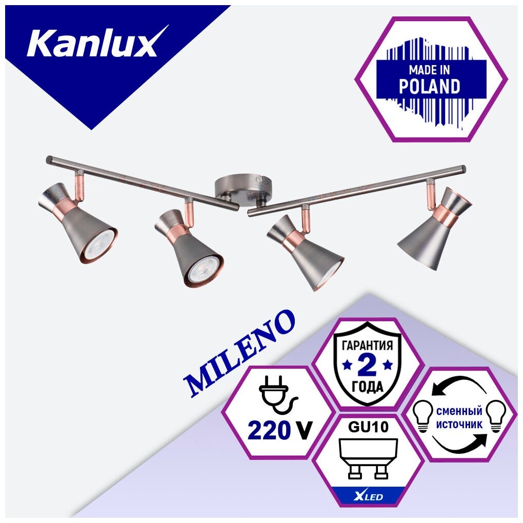 Споты потолочные Kanlux MILENO — это ответ на новейшие тенденции. Дизайн, блеск и форма выделяют данную серию из большого ассортимента. А самые востребованные модели от 1 до 4 точек позволят создать единую композицию при помощи разных сочетаний как по цвету, так и по количеству спотов. Сменный источник света GU10 позволит сделать окончательный штрих в создании интерьера так как позволит подобрать мощность, цветовую температуру и световой поток подходящий именно под ваш проект.