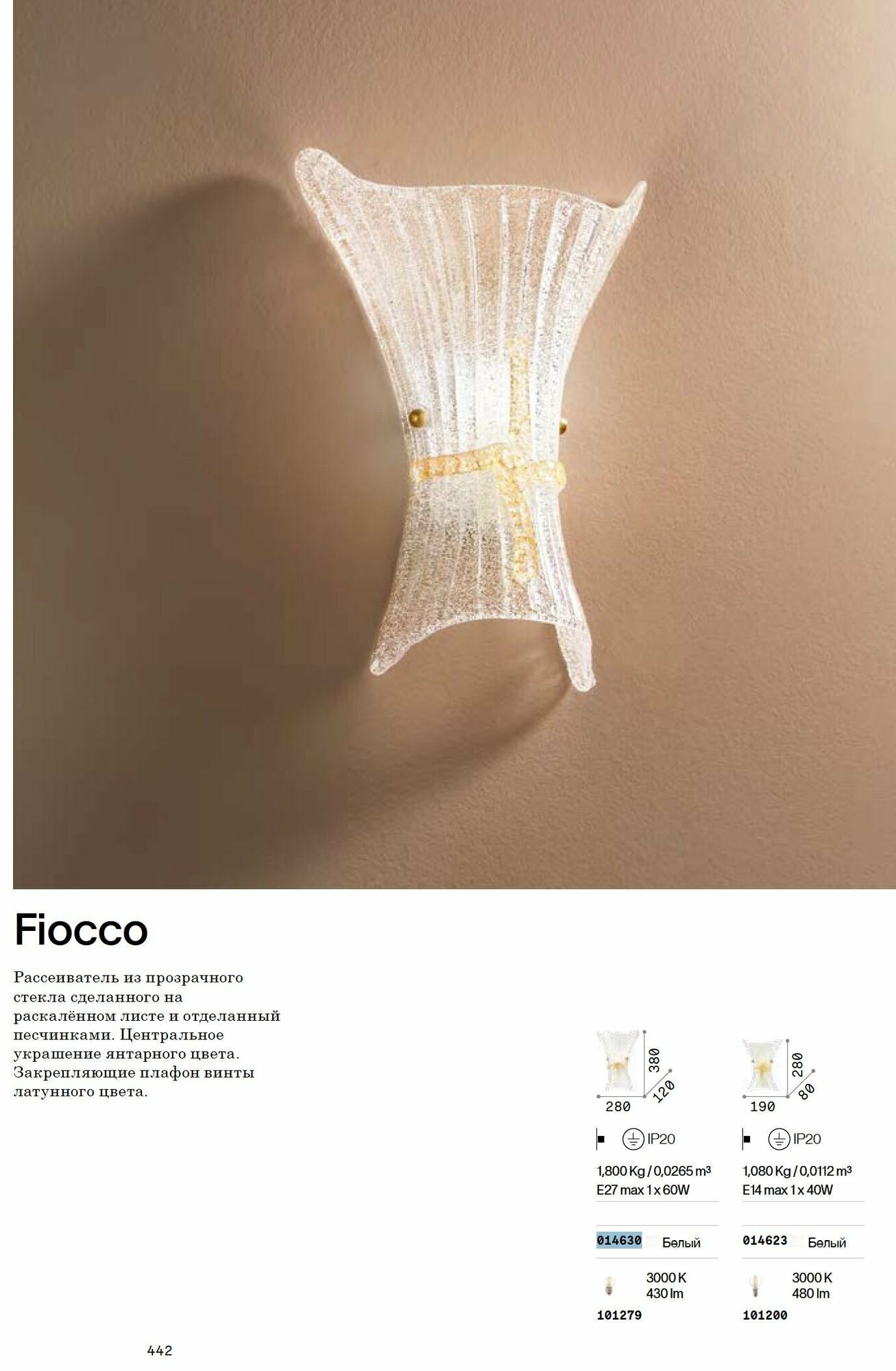 Светильник настенный Ideal Lux Fiocco Н380 макс.60Вт Е27 IP20 230В Прозрачное/Янтарное стекло 014630. Рассеиватель из прозрачного стекла сделанного на раскалённом листе и отделанный песчинками. Центральное украшение янтарногоцвета. Закрепляющие плафон винтылатунного цвета.