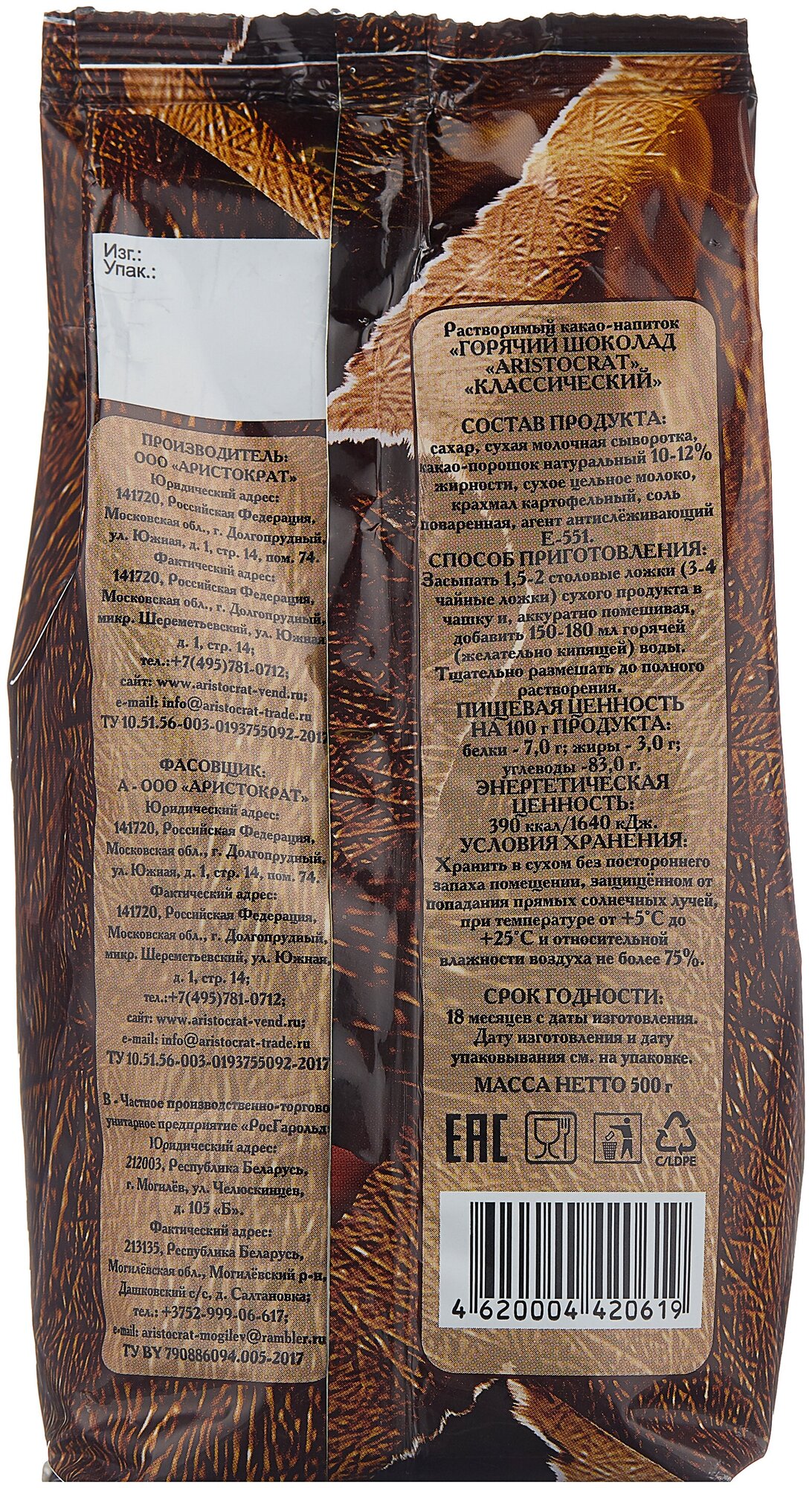 Классический горячий шоколад от компании " ARISTOCRAT" - это легкий шоколад, с ярко-выраженным вкусом молочного растопленного шоколада. Этот напиток является отличным профилактическим средством от сердечно-сосудистых заболеваний и опухолей. Такое благотворное влияние на организм обосновано высоким содержанием в жидком шоколаде флавоноидов. Эти вещества способствуют улучшению функций кровеносных сосудов и снижению пагубного влияния на организм человека свободных радикалов. Классический порошковый горячий шоколад с мягким вкусом. Легкий шоколад, с ярко-выраженным вкусом молочного растопленного шоколада. Не зря горячий шоколад называют "Напитком Богов"!Состав:сахар, сухая молочная сыворотка, какао-порошок натуральный 10-12% жирности, сухое цельное молоко, соль поваренная, крахмал картофельный, агент антислеживающий Е551.Способ приготовления:засыпать 1,5-2 столовые ложки(3-4 чайные ложки) сухого продукта в чашку и, аккуратно помешивая, добавить 150-180 мл горячей( желательно кипящей) воды. Тщательно перемешать до полного растворения.