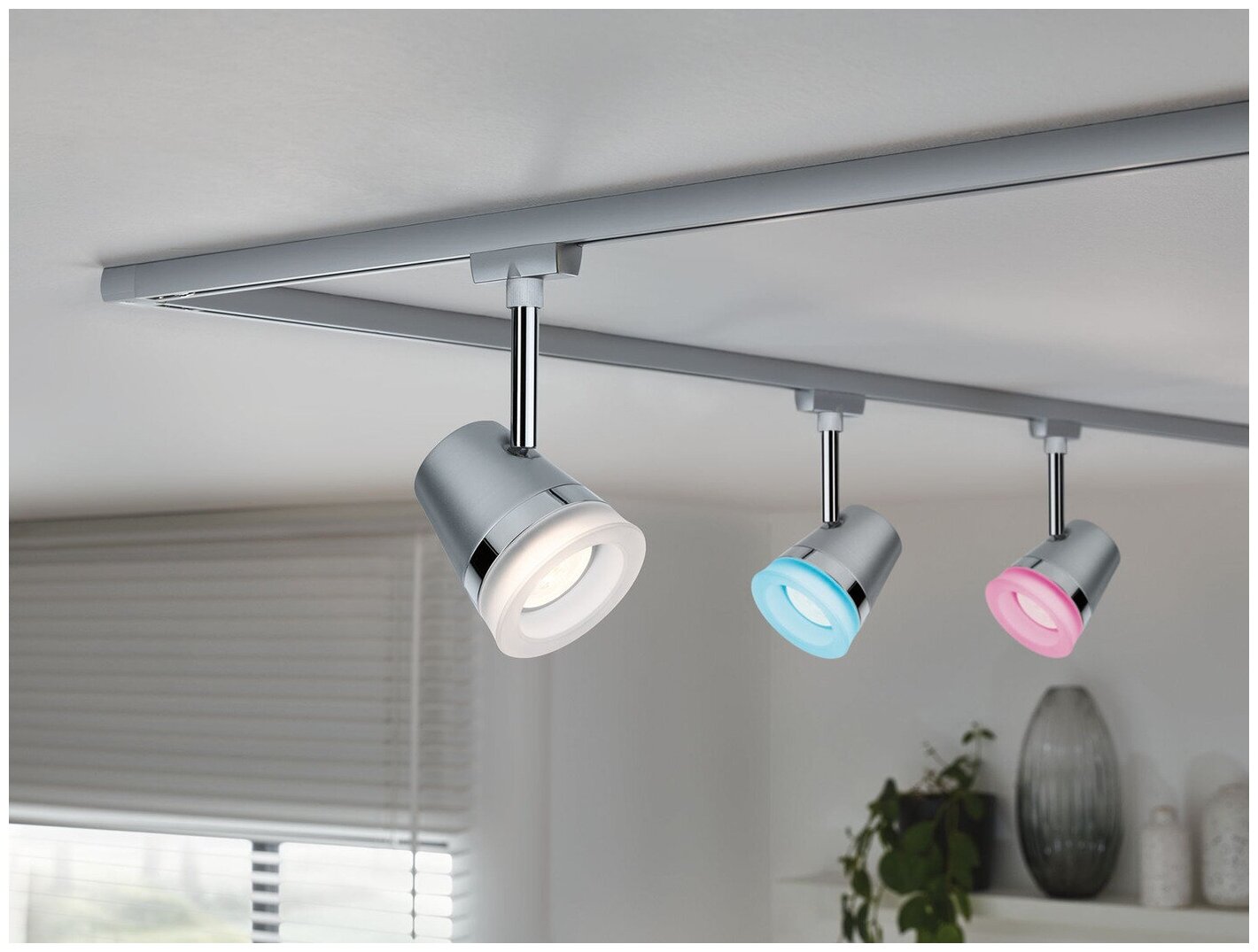 Светильник Paulmann Cone Шинная система URail 5.5Вт 350Лм 2700-6500К GU10 230В Хром матовый с изменением цвета RGBW по технологии ZigBee 95525.Различные зоны комнаты могут быть легко освещены с помощью универсальной шинной системы URail 230 В. Конусный светильник можно направить так, чтобы свет попадал именно туда, где он нужен. Картины, мебель или другие предметы декора особенно привлекают внимание за счет направленного освещения. В зависимости от вашего настроения сменная умная лампа позволяет выбирать между настоящим теплым белым, цветным светом и различными эффектами. Лампа совместима с Zigbee 3.0.- Светильник для шинной системы URail, включая инструкции по сборке.- Направленный свет расставляет световые акценты, освещая предметы.- Можно управлять с помощью пульта дистанционного управления Smart Home Zigbee (арт. 50067).- Можно так же включать и выключать с помощью выключателя света.- RGBW разноцветное изменение цвета.- Цветовая температура: от 2700К - теплый белый до 6500К - дневной белый.