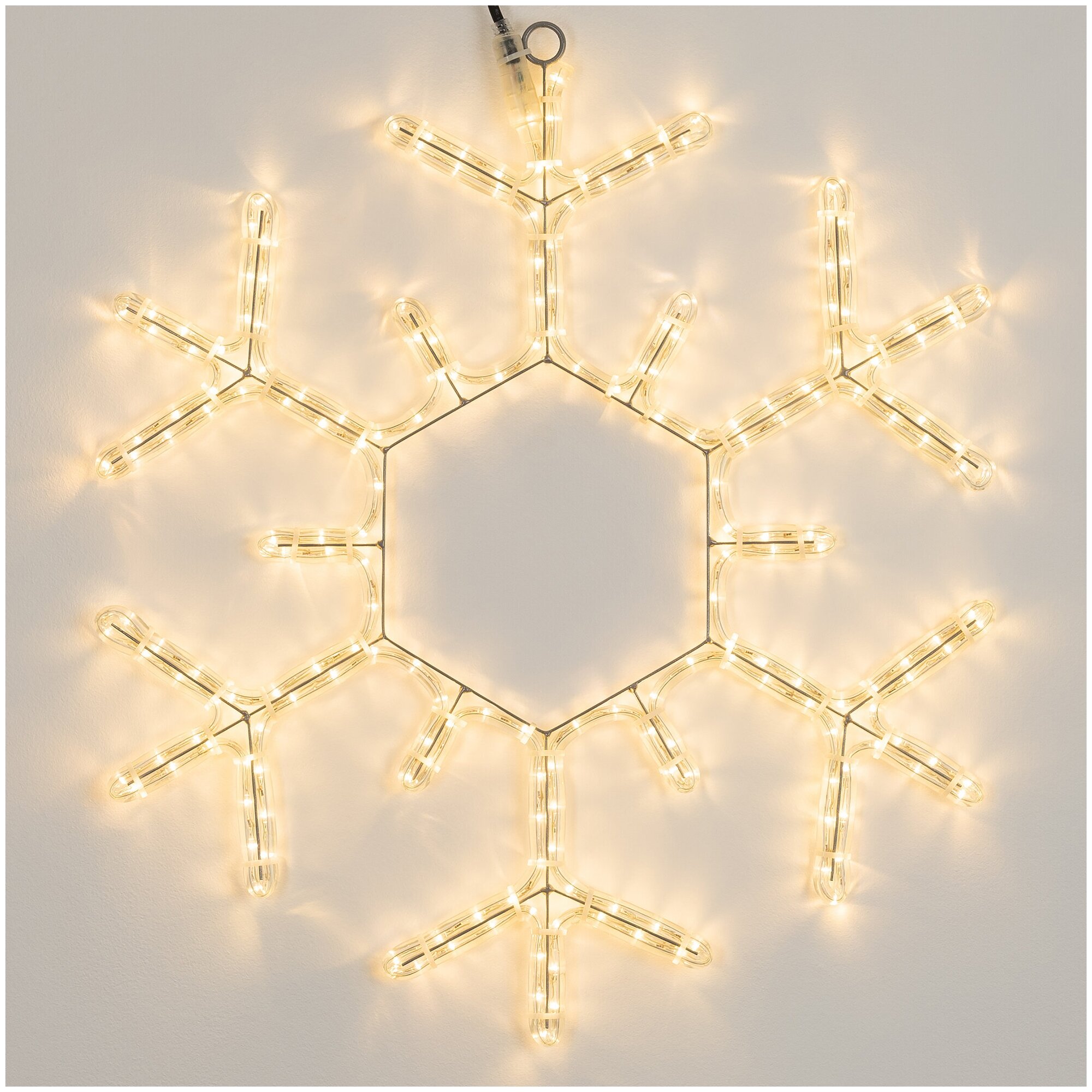 Светодиодная фигура СНЕЖИНКА. Размер 600x600 мм. Цвет светодиодов ТЕПЛЫЙ БЕЛЫЙ (3000 К), постоянное свечение. 360 светодиодов. Напряжение питания 230 В, потребляемая мощность 20 Вт, степень пылевлагозащиты IP65. Фигура укомплектована проводом питания для подключения к сети 230 В (без вилки питания).
