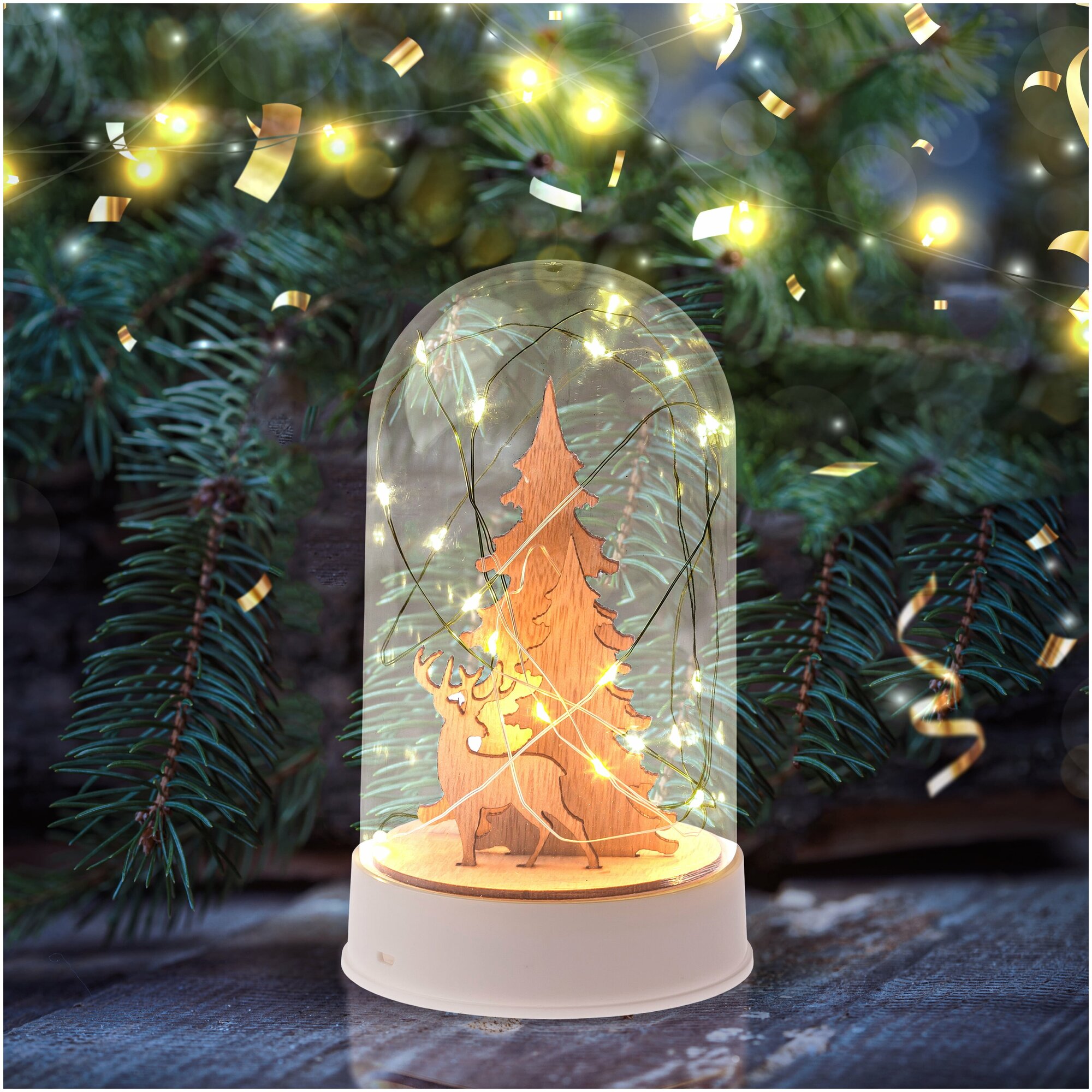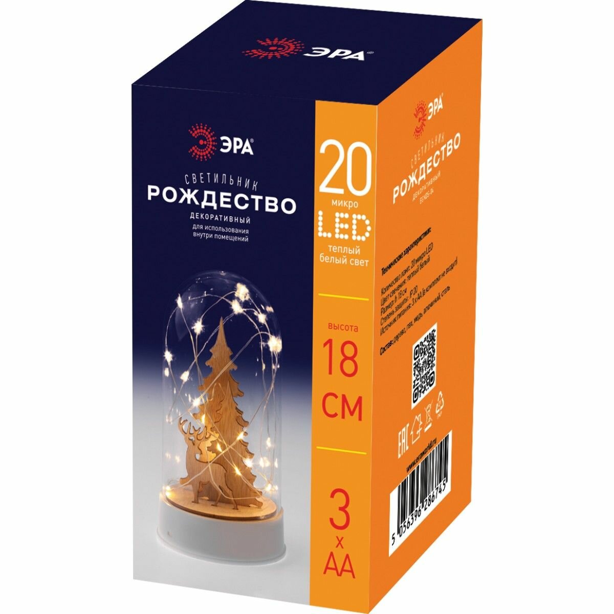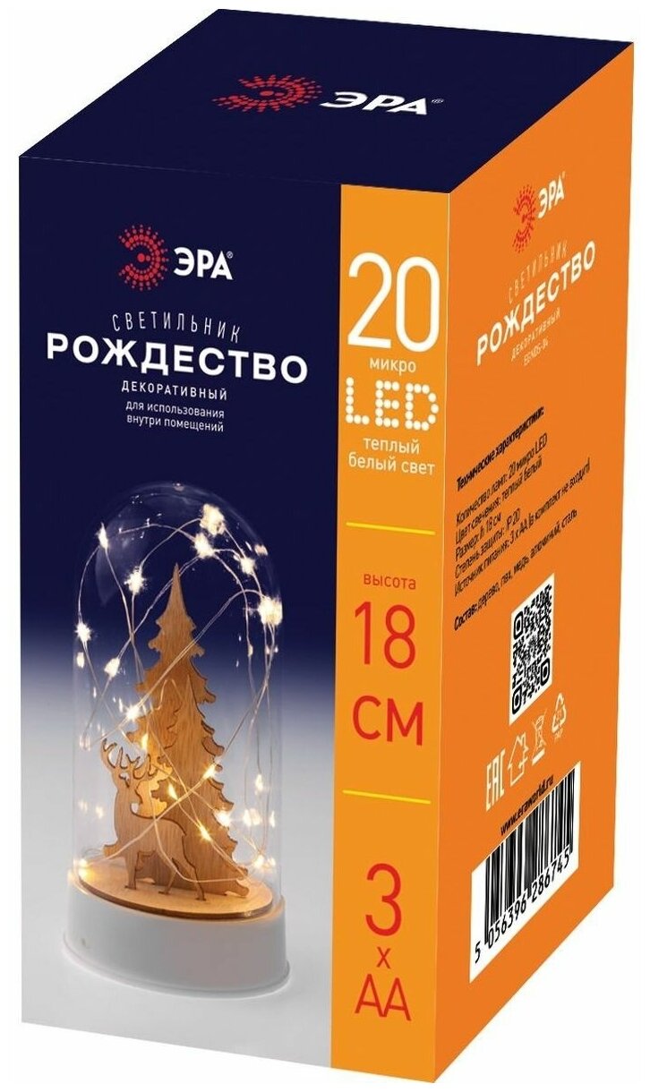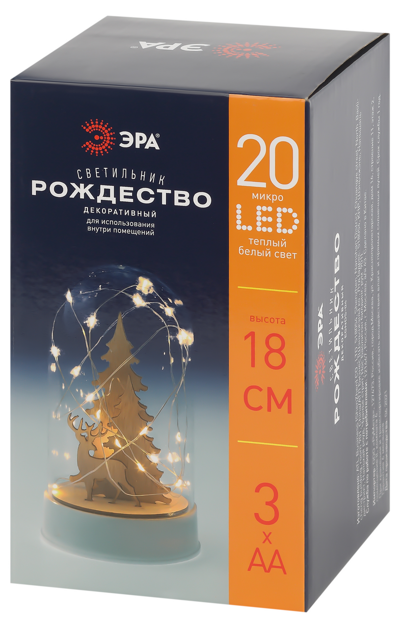 Новогодний светодиодный светильник ЭРА "Рождество" высотой 18 см от бренда ЭРА подарит атмосферу уюта вашему дому! Декоративный светильник представляет собой прозрачный клош с маленькими деревянными фигурками елочек и оленя внутри, окутанными светодиодной гирляндой с теплым светом из 20 светодиодов. Работает от трех батареек АА, класс защиты IP20 (использовать в помещениях). Настольный светильник фонарик украсит интерьер кухни, гостиной или же спальни (в качестве ночника). Светильник будет чудесно смотреться на праздничном столе, а деревянные фигурки зимнего леса понравятся детям. Это оригинальный подарок на Новый год и Рождество, ведь такой новогодний декор для дома всегда поднимает настроение!